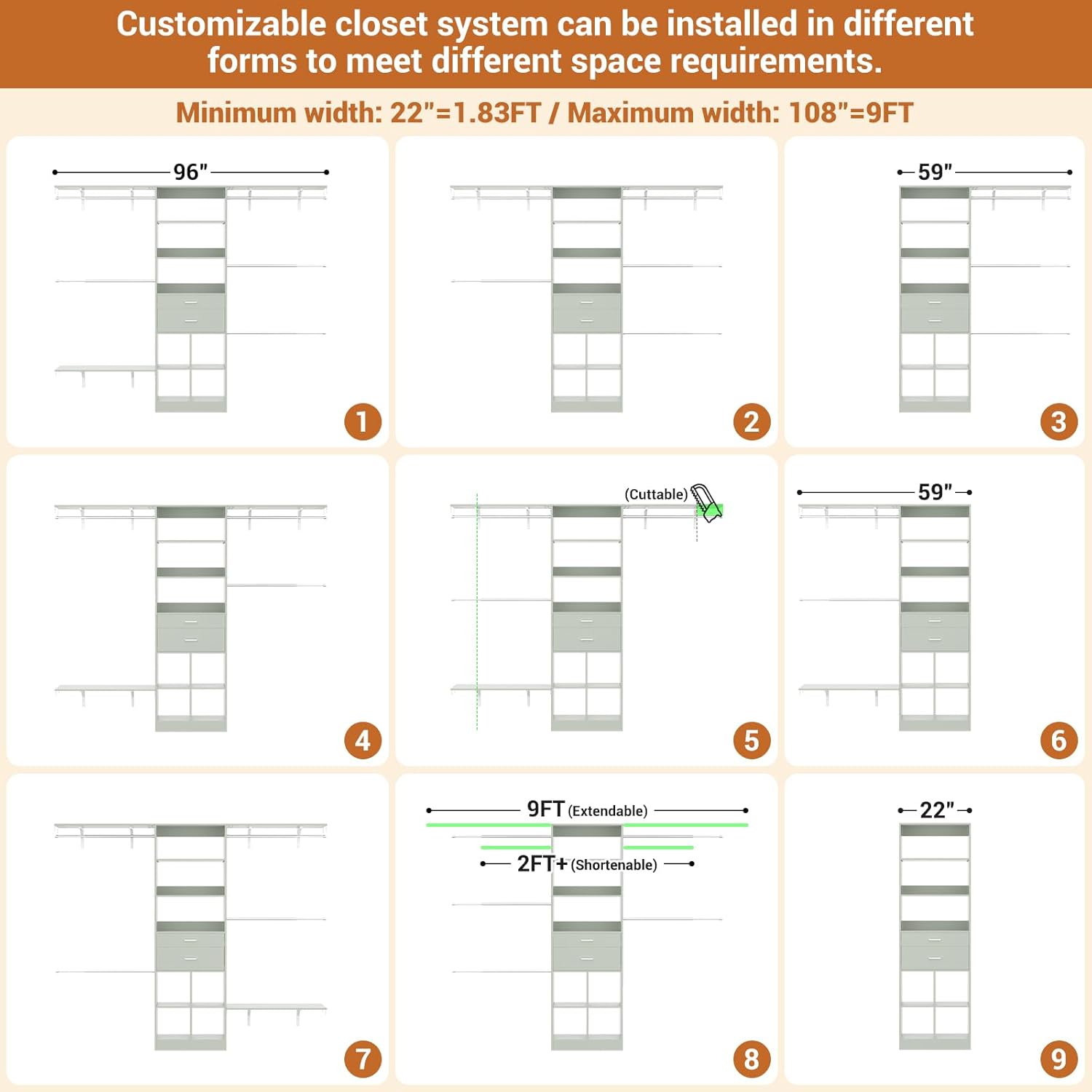 - Customizable Closet System - Besiost closet system with drawers is a valuable addition to your nursery organization and walk-in closets. The small modern closet comes with additional cuttable shelves and adjustable hanging rods, designed to fit well in nurseries of varying sizes. Width: 59"–96", Height: 80"