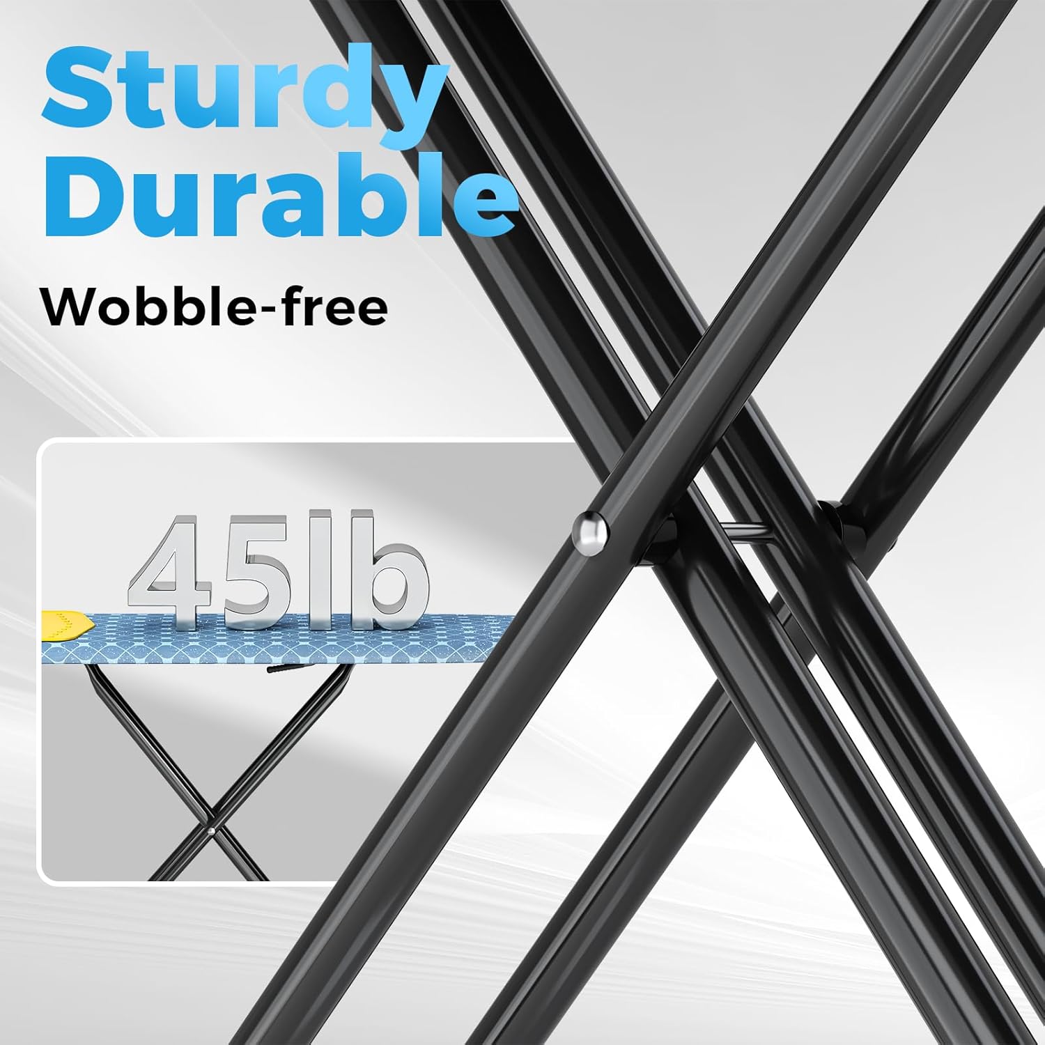 - Breathable Extra-Wide Panel: This ironing board features a spacious surface with dimensions of 13x43 inch, large enough to lay out various types of clothing, generously sized top allows for efficient and effective ironing, saving you time and effort. Mesh design make ironing stand dissipates heat quickly, allowing you to easily achieve a smooth and flat ironing effect