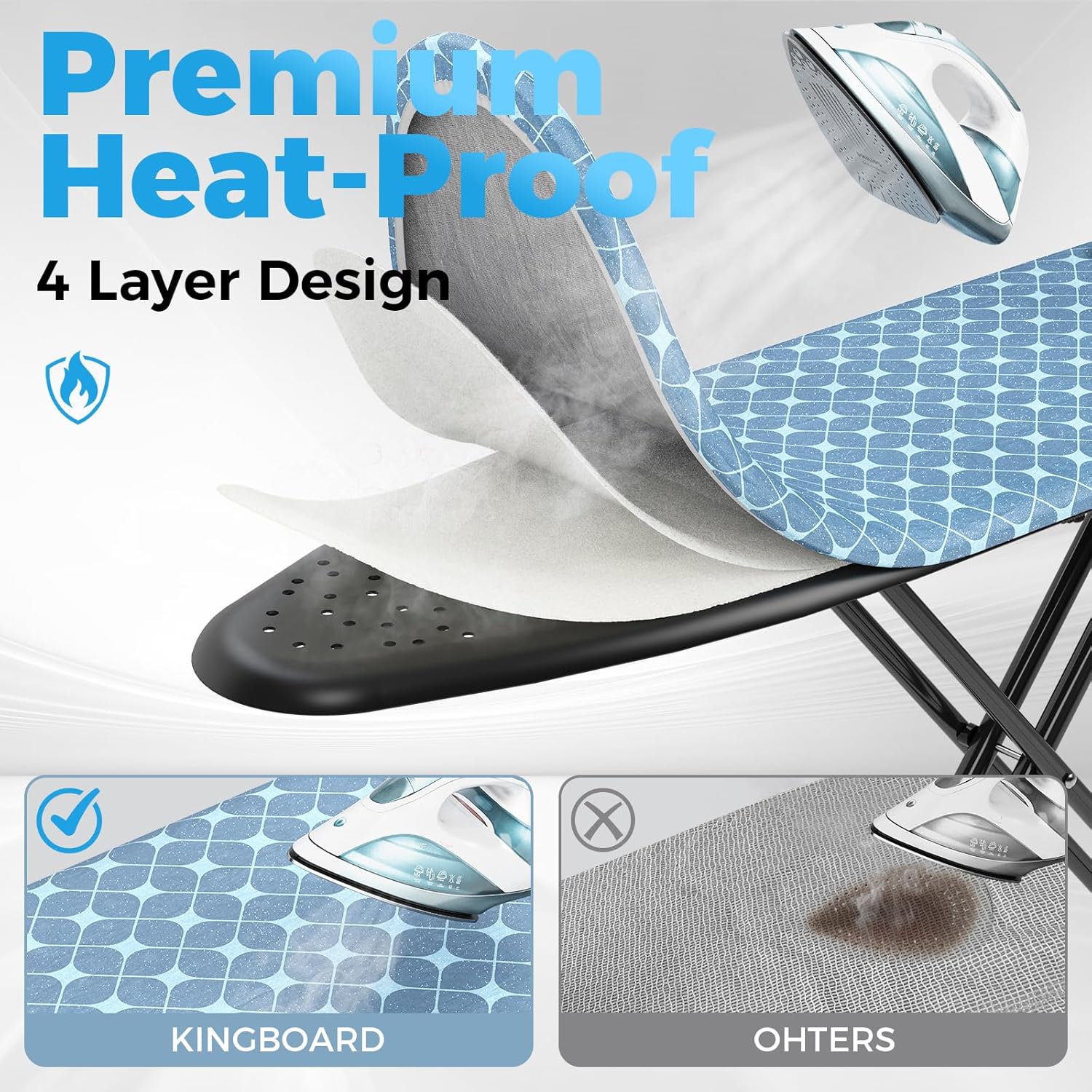 - Heat-Resistant & Washable Cover: KINGBOARD Ironing board with 5mm needle-punch cotton, 5mm sponge padding and heat-resistant fabric effectively preventing being damaged due to high temperature during ironing, ensuring long-term and stable use. Specially treated, the surface of the cloth cover has super wear resistance