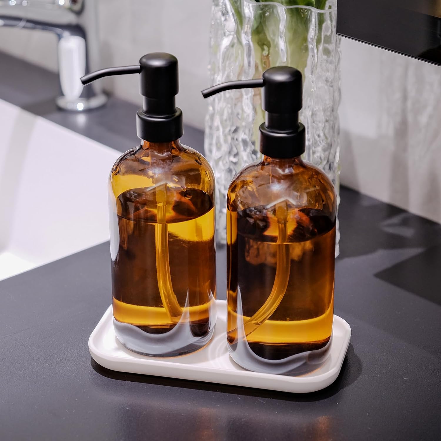 - Stylish Amber Glass Design: Sleek round 17 fl oz amber glass dispenser (8.2'' x 3'') adds elegance to kitchens/bathrooms, complementing farmhouse, vintage, or modern decor. UV-protective amber glass preserves liquids like soap, lotion, or dish soap.