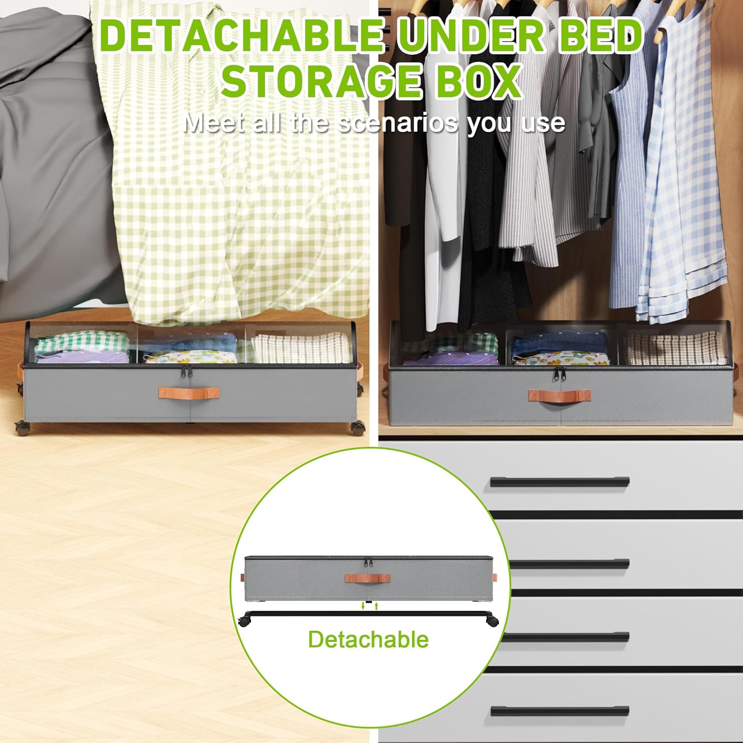 - 【360° Rotating Slide Wheels】Mobile storage no stress. Under Bed Storage Containers is equipped with 3 X side handle and 4 x 360°rotating wheels, that glide effortlessly on various surfaces. There is no sound when sliding, Beborxue Underbed storage baskets are ideal for bedrooms, living rooms, dorms, shoe cabinets, attics, basements and other places to use.