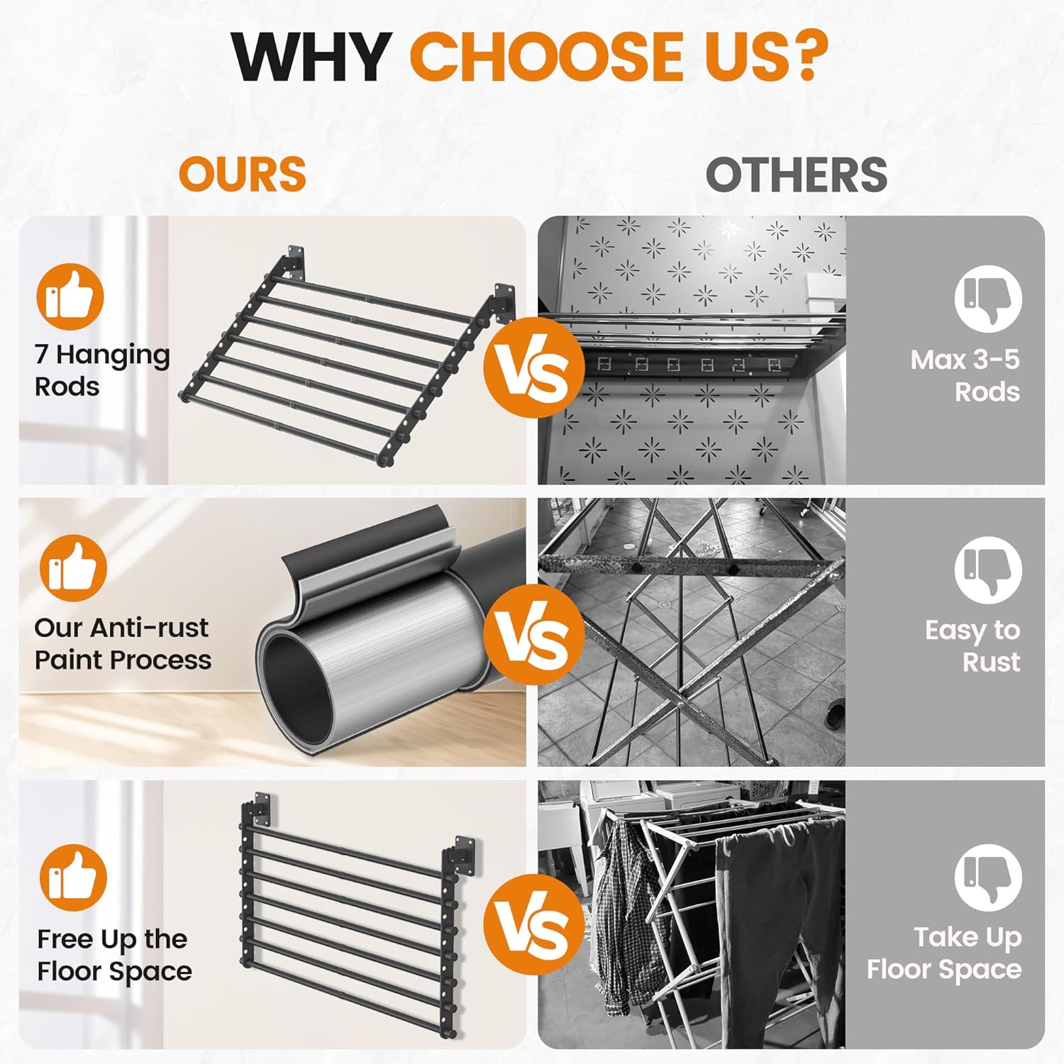 - 7-Rod Large Capacity for Drying Multiple Items - Equipped with seven sturdy horizontal rods, this wall mounted drying rack offers generous hanging space. Perfect for drying clothes, towels, pillowcases, and other laundry items all at once.