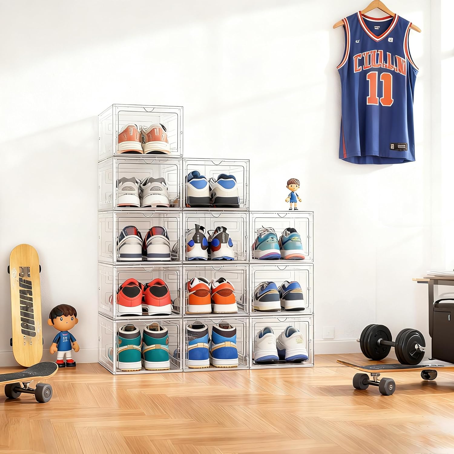 Pinkpum Upgraded Hard Shoe Storage Box 12 Pack X-Large Fit Size 12, Thicken & Sturdy Clear Plastic Stackable Shoe Organizer Box Closet, Sneaker Storage Display Case Holder Bins with Magnetic Door