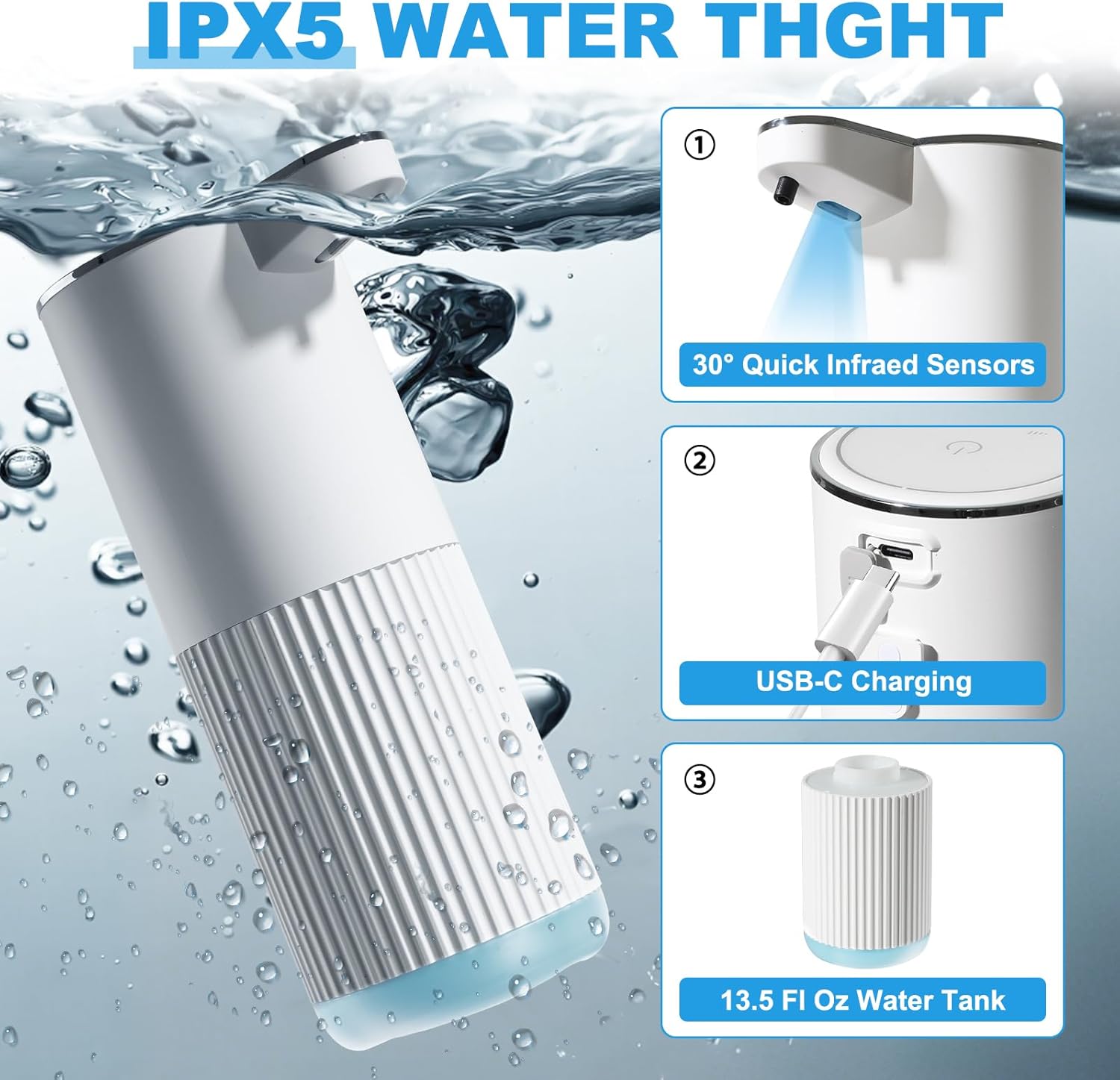 - 【IPX5 WATERTIGHT & EXTENDED BATTERY LIFE】Engineered with IPX5-rated watertight, this auto soap dispenser touchless withstands splashes in damp environments like sinks or showers. A secure rubber seal safeguards the charging port in humid conditions. The integrated 1200mAh battery supports up to 60 days of daily use on a single USB-C charge—no frequent recharging needed.