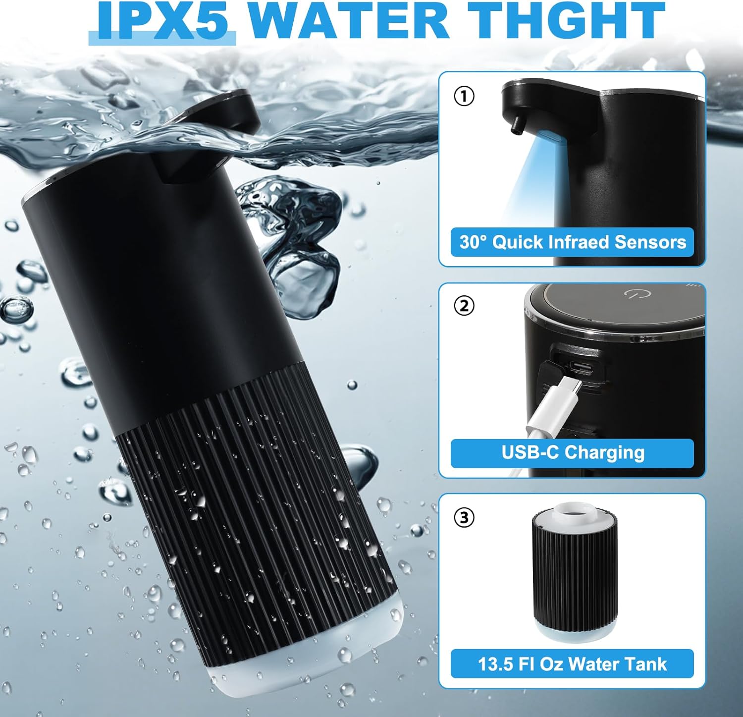 - 【IPX5 WATERTIGHT & EXTENDED BATTERY LIFE】Engineered with IPX5-rated watertight, this auto soap dispenser touchless withstands splashes in damp environments like sinks or showers. A secure rubber seal safeguards the charging port in humid conditions. The integrated 1200mAh battery supports up to 60 days of daily use on a single USB-C charge—no frequent recharging needed.