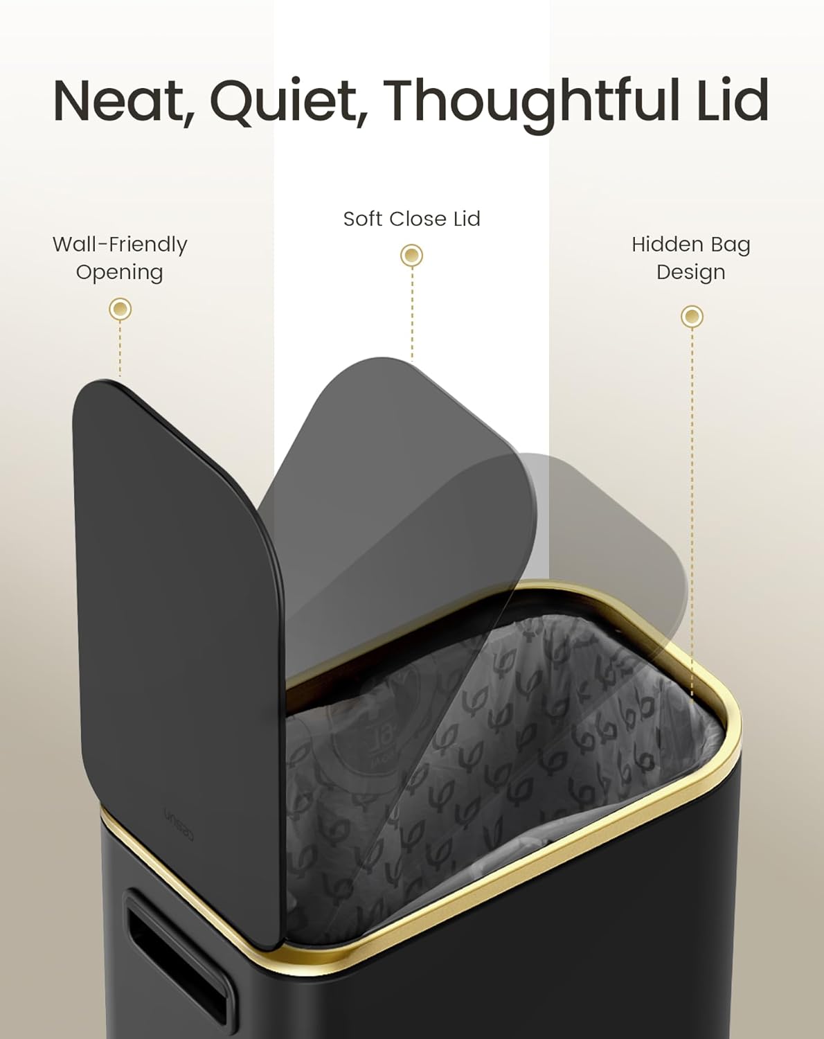- Modern Minimalist Style: A monochrome black body paired with gold-trimmed lid edges and pedal creates elegant minimalist aesthetics. The matte finish balances metallic accents, seamlessly blending into modern, nordic or light luxury interiors to elevate your space