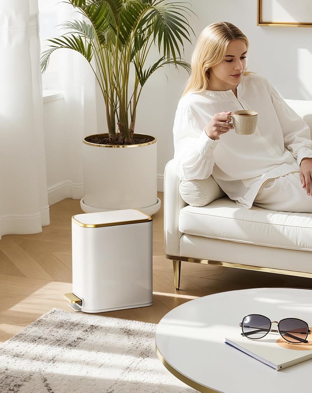 - Modern Minimalist Style: A monochrome white body paired with gold-trimmed lid edges and pedal creates elegant minimalist aesthetics. The matte finish balances metallic accents, seamlessly blending into modern, nordic or light luxury interiors to elevate your space.