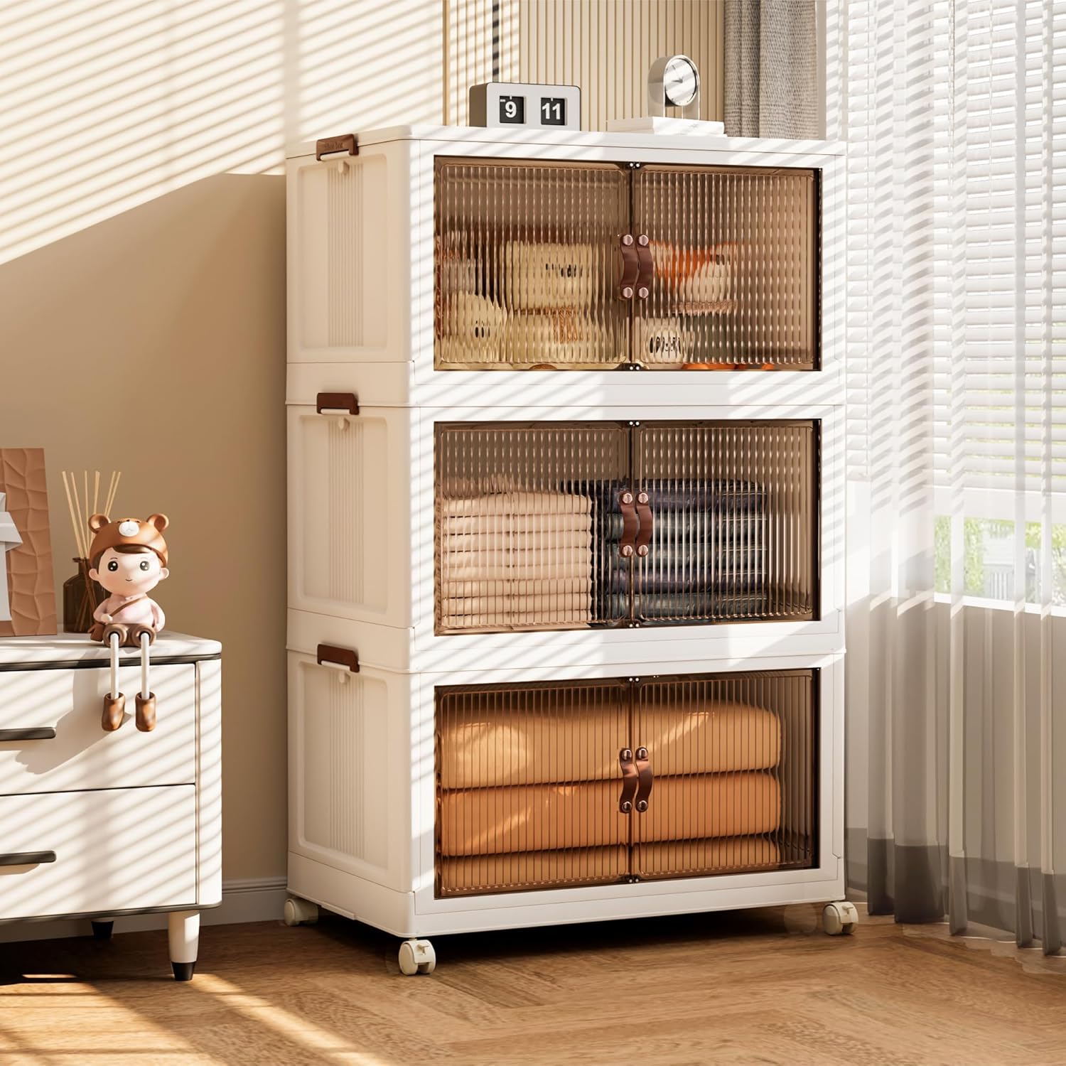 - 【Stackable & Magnetic Door & Rotating Wheels】The storage box has a groove design for stacking stackable storage bins. With side and rear buckles, the stacked boxes stay steady and secure. Equipped with four 360° rotating wheels, it’s easy to move and perfect for closet organizers and storage, keeping your space organized.
