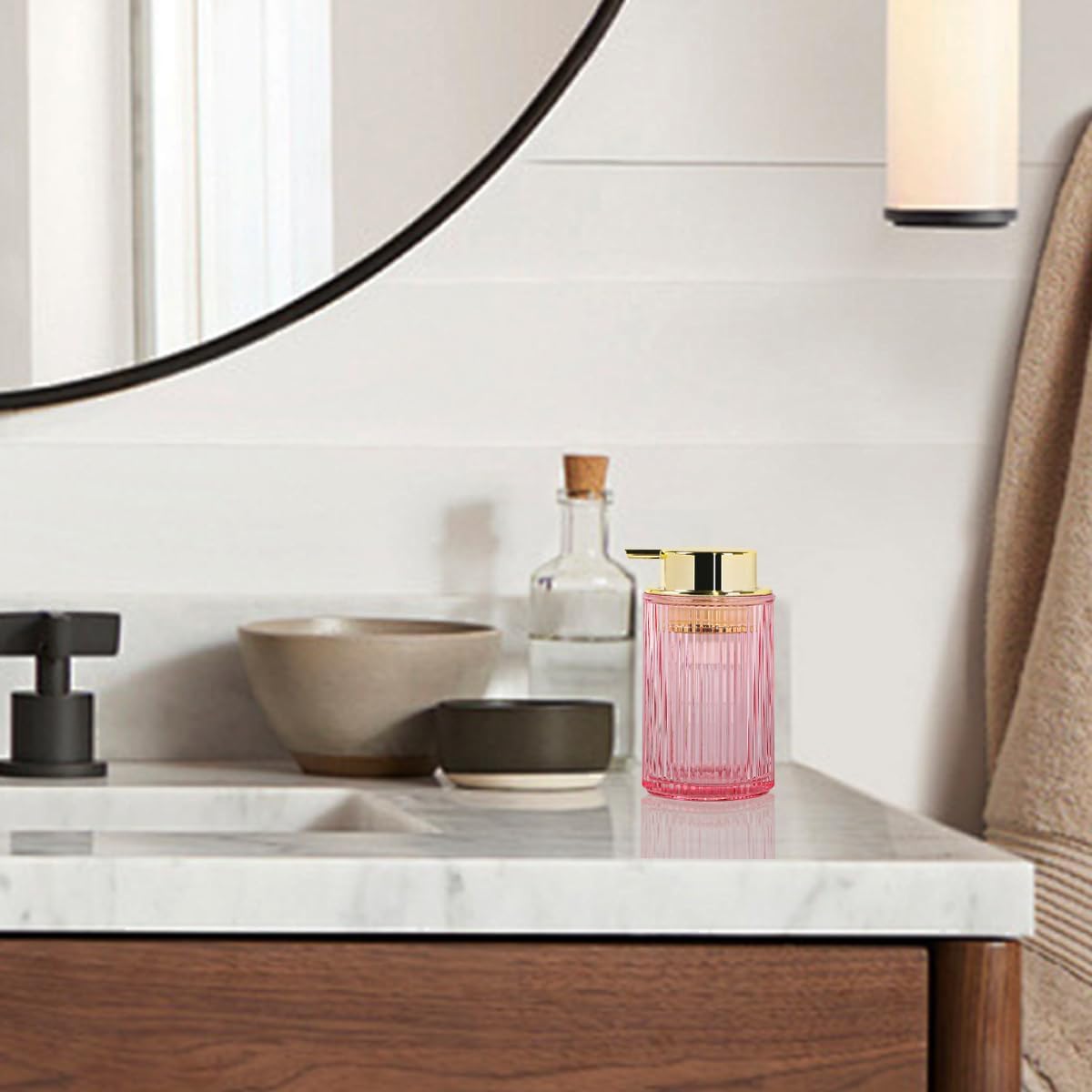 Pink Foaming Soap Dispenser, 12 Oz Glass Foaming Hand Soap Dispenser with Gold Pump, Bathroom Refillable Liquid Lotion Container Pump Ribbed Bottle for Kitchen Bathroom Decor, 1pc