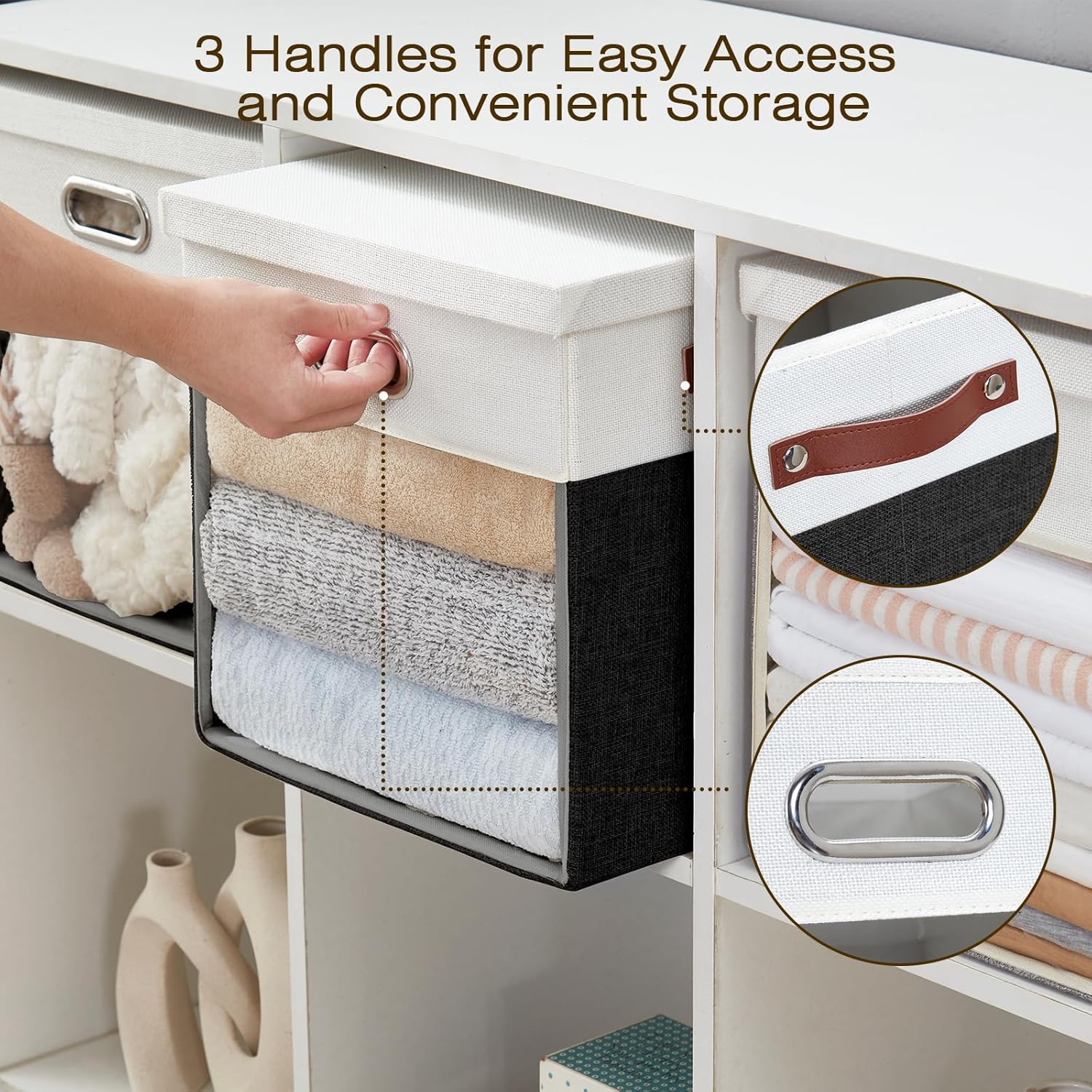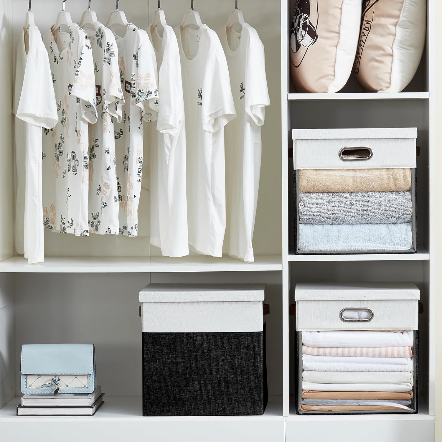 Fabric Storage Cubes with Clear Windows and Lids, 13'' Foldable Storage Bins with 3 Handles, Decorative Storage Boxes for Home, Bedroom, Closet, Office (Balck & White)