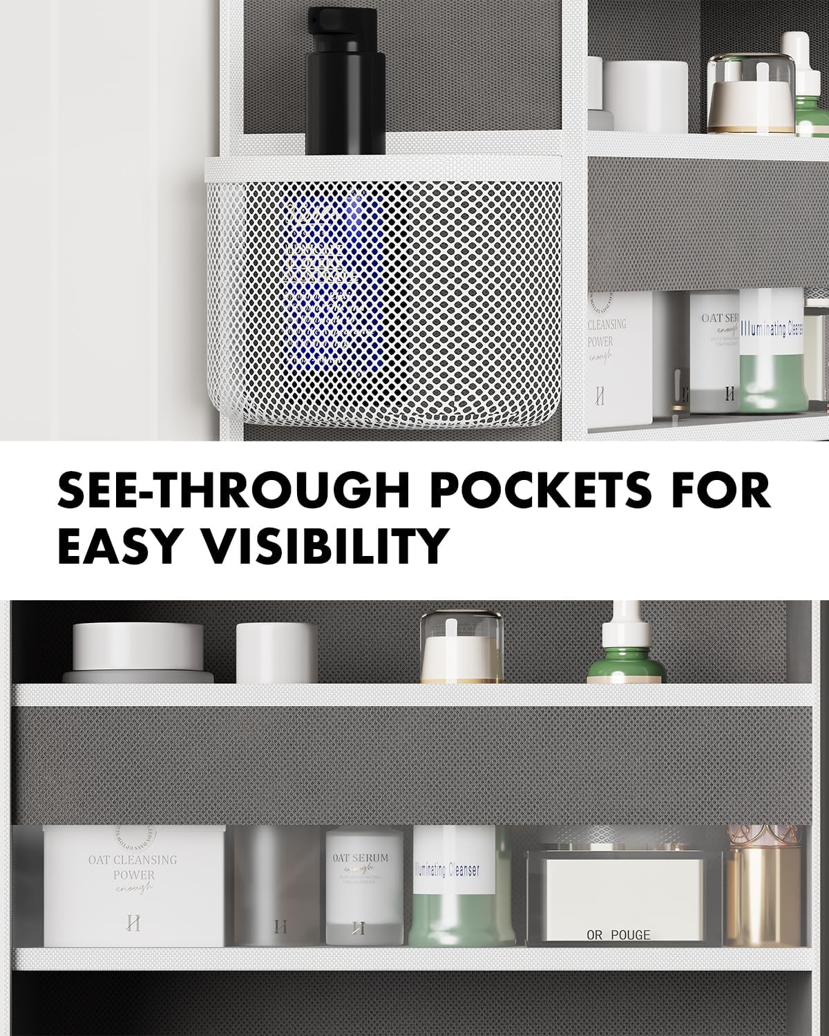 - Anti-Tilt Safety Structure Design: 6 tier door hanging organizer is made of high quality double-layer non-woven fabric, durable, breathable, safe and non-toxic. Our over the door bathroom organizer feature sturdy seams to close the pockets and are reinforced with strong cardboard on the front, sides and bottom to prevent sagging and tilting, ensuring that the organizer stays upright and secure. The back is equipped with four velcro straps to ensure that the hanging door organizer fit snugly against the door panels and will not move/shake when opening and closing the door.