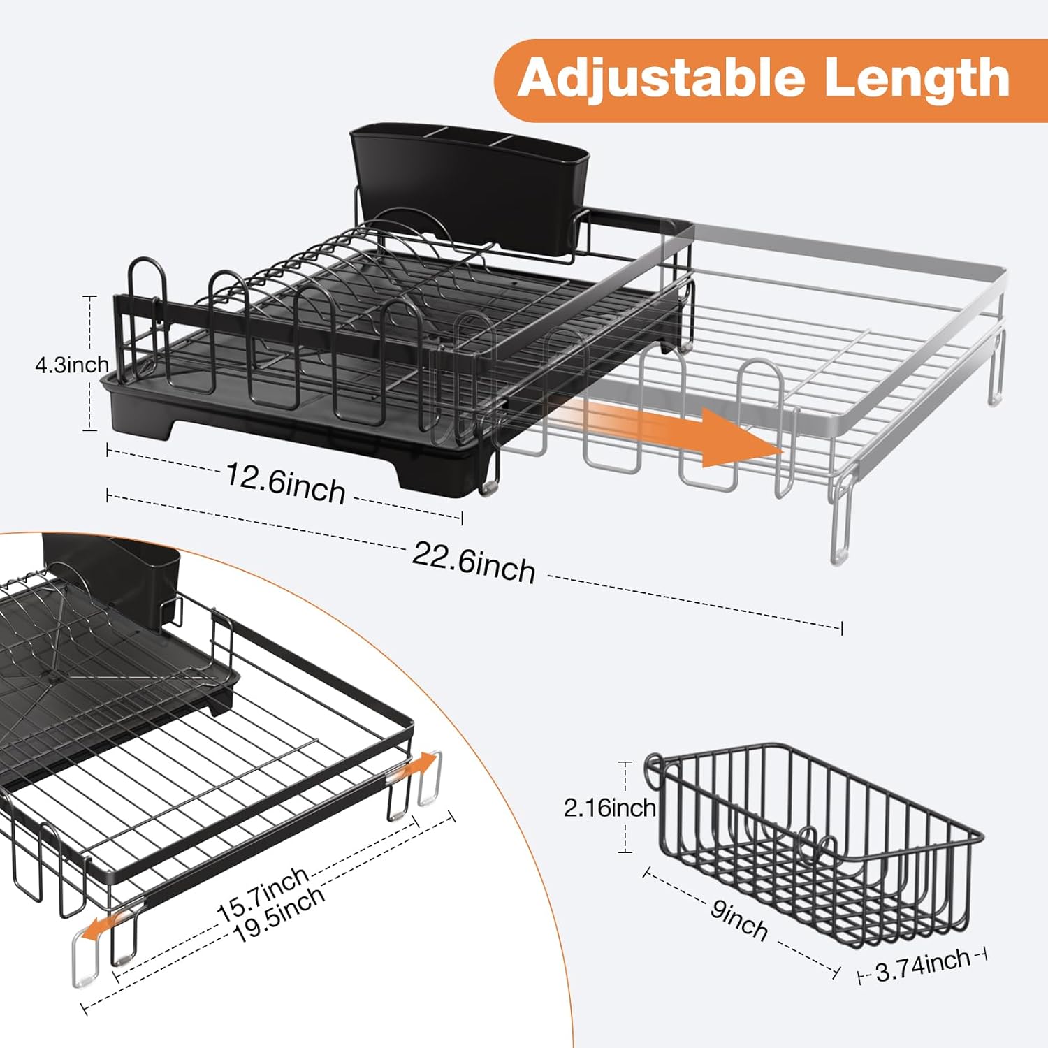 - Extendable & Spacious Design: Our dish drying rack adopts an extendable design, expanding from 22.6" (57.5cm) in length to fit your kitchen needs. With a generous 16.5" (42cm) width and 4.3" (11cm) height, this multifunctional dish rack provides ample space for cups, bowls, plates and pans.