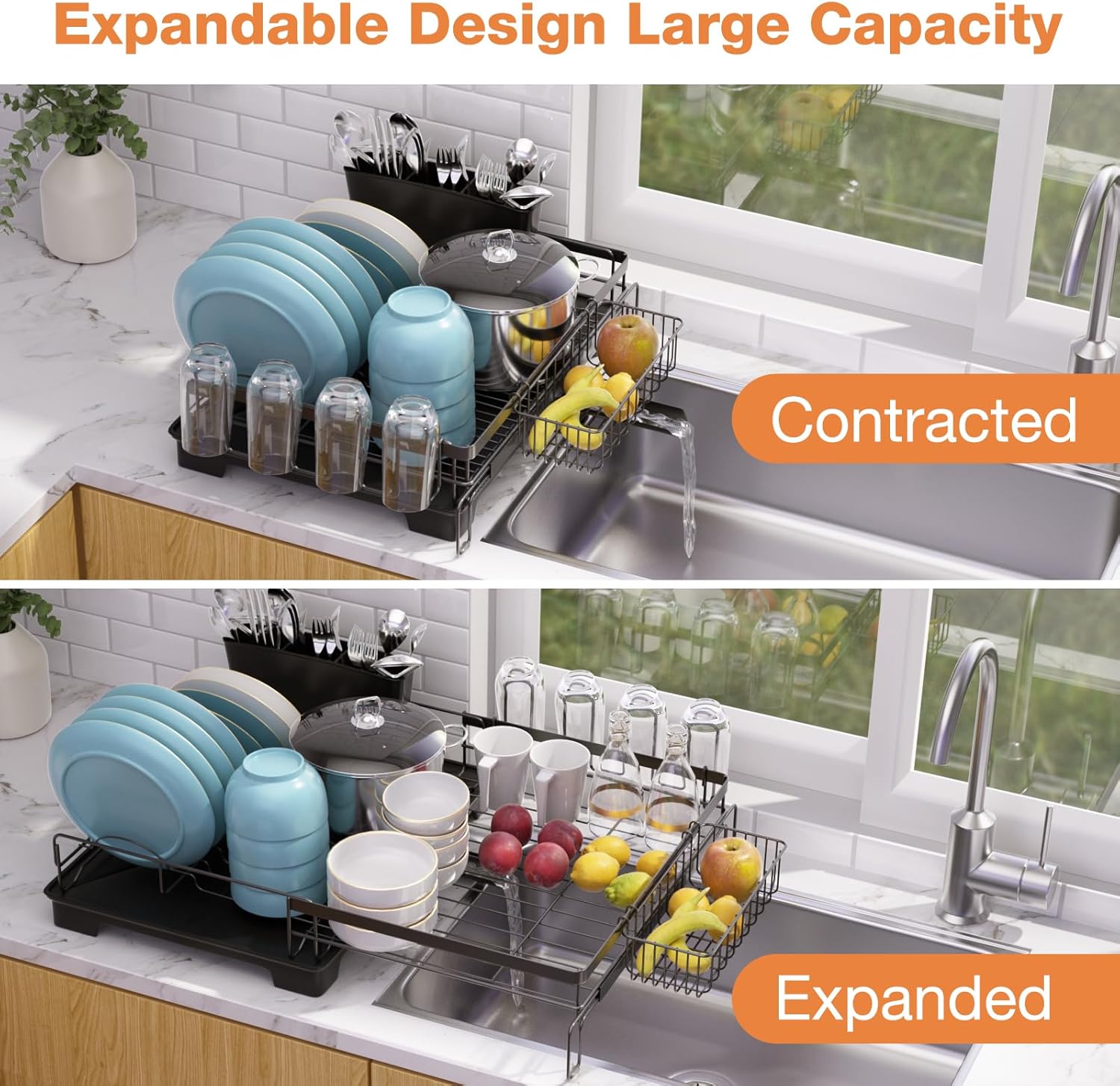 Dish Drying Rack,Extendable Dish Rack,Drying Rack with Automatic Drainboard,Dish Drainers for Kitchen Counter,Anti-Rust Dish Drainers with Cup Holders & Utensil,Black