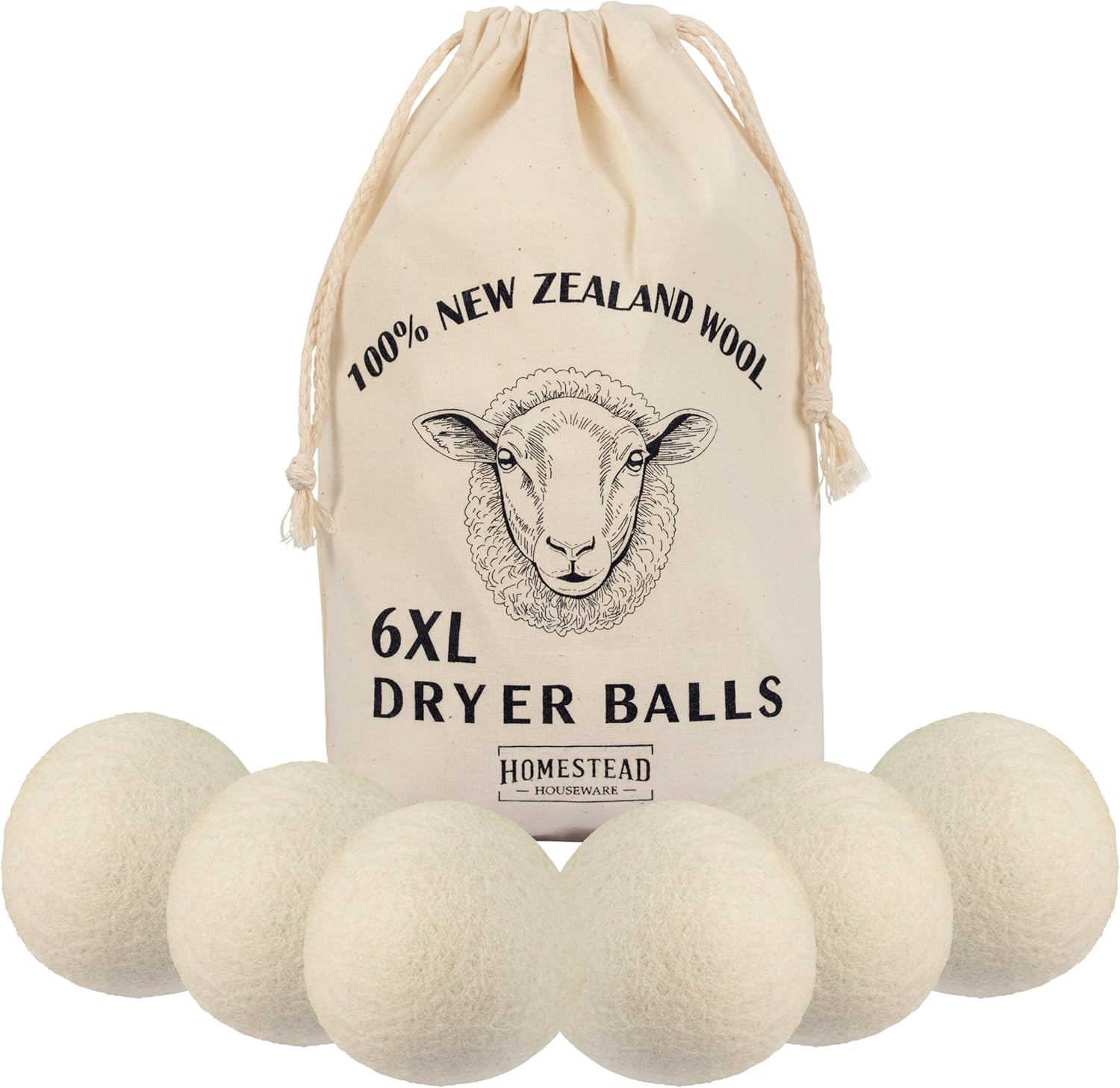 XL Wool Dryer Balls 6-Pack – 100% New Zealand Wool, Natural Fabric Softener & Static Reducer, Reusable Laundry Balls for Pet Hair, Eco-Friendly Dryer Sheets Alternative