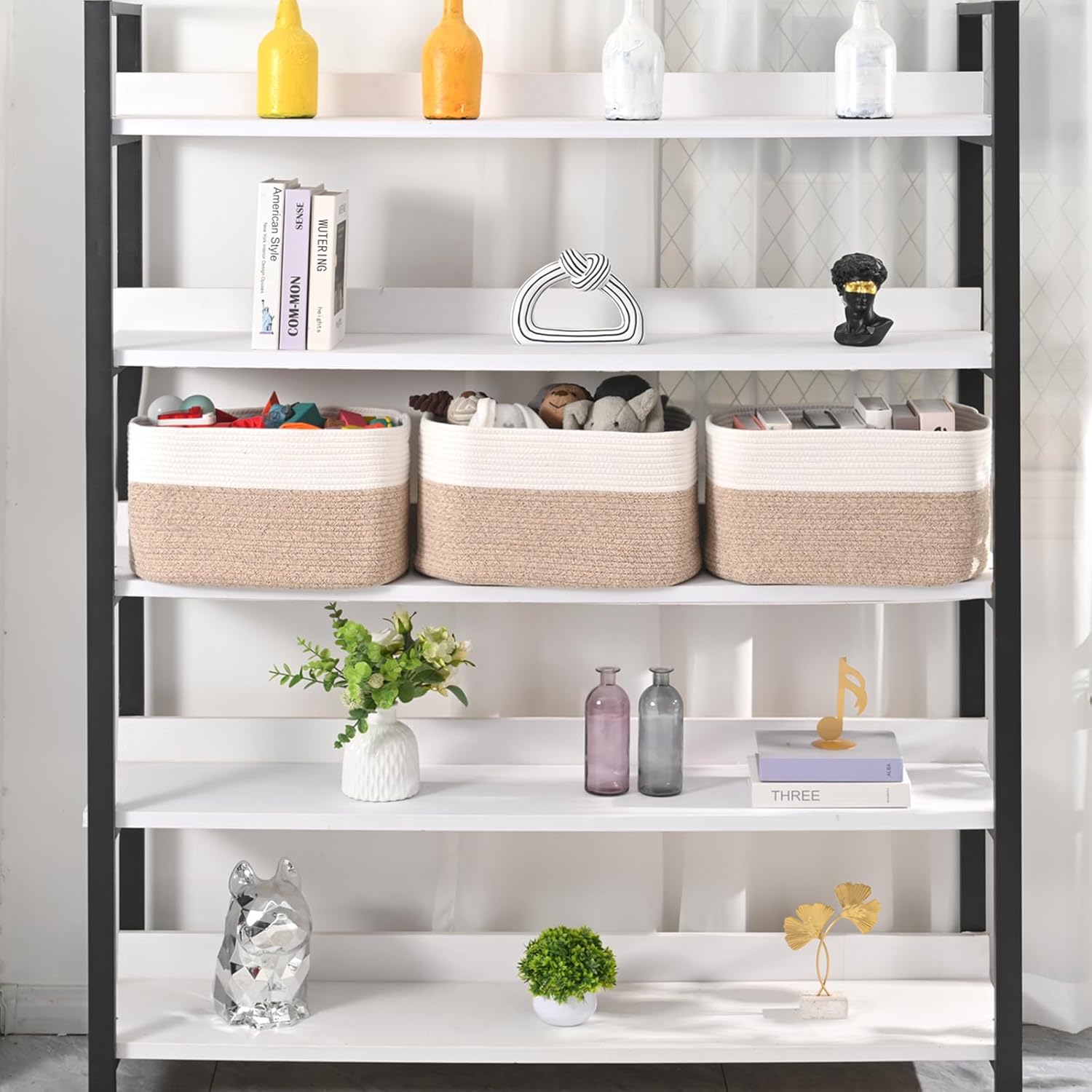 Large Storage Baskets for Organizing Shelves, Woven Cotton Rope Bins for Baby Nursery Organization, Book Toy Towel Organizer, 17"x13"x9.5", 3 Packs, Off White & Brown