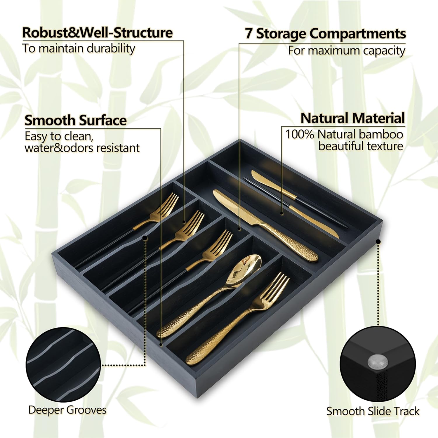 Silverware Organizer, 12.5 Inch Utensil Organizer Kitchen Drawer Organizer Bamboo Silverware Holder Cutlery Tray Organizer in Drawer Flatware Organizer Tray(7 slots, Black)