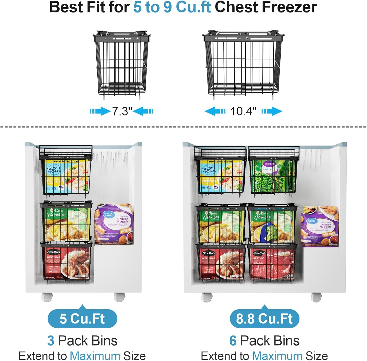 iSPECLE Freezer Organizer Bins - 1 Pc Hanging Basket & 2 Pcs Adjustable Wider & Deeper Chest Freezer Organizer Bins for 5 to 9 Cu Ft, Extra Large & Easy Organize Stackable Basket Store More, Black