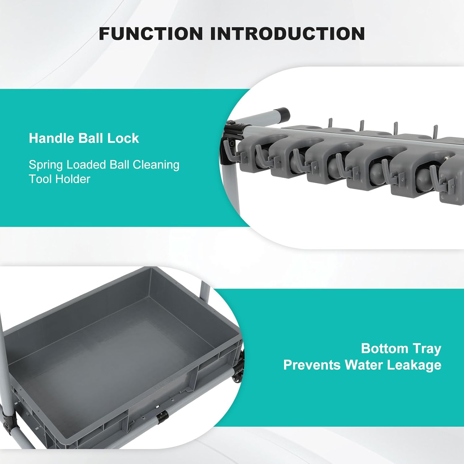 - 【Ample Storage Capacity】Our standing cleaning tool cart features 10 tool slots and 12 additional hooks, allowing easy storage and brooms, mops, and other cleaning supplies, keeping your cleaning area organized and tidy.