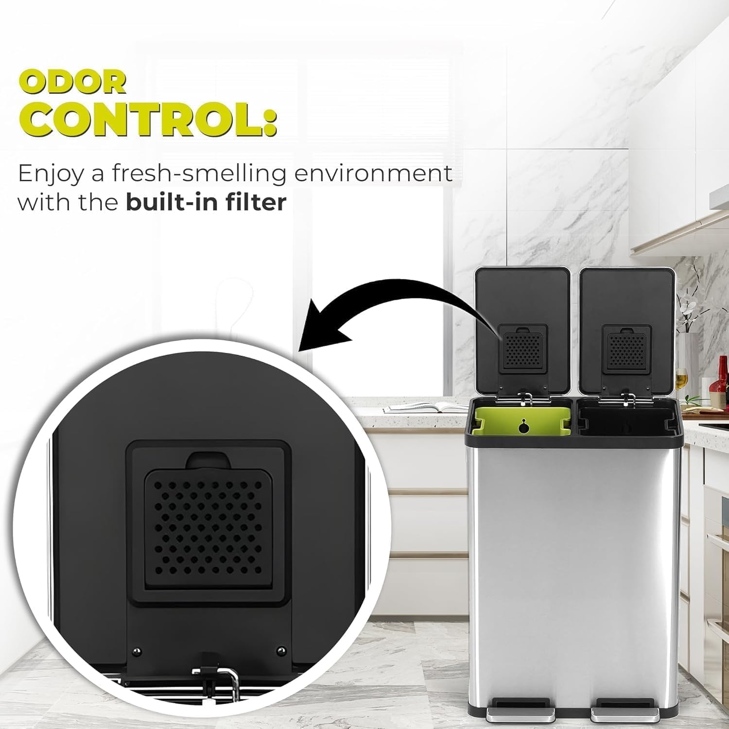 SIMPLI-MAGIC 16 Gallon (60L) Dual Compartment Step Trash Can – Kitchen Garbage Can with Waste & Recycling Bins – Slow-Close Lid, Odor Control, Hands-Free, Inner Bases, Premium Stainless Steel