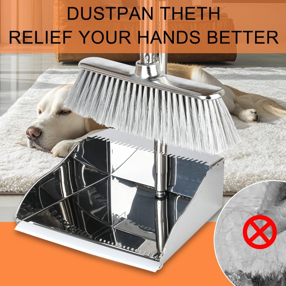 - 【Self-Cleaning Dustpan Teeth】Built in comb/Teeth for easy to Clean Broom into Dustpan , Clean Pet Hair and Human Hair with one Pull on the Teeth. The rubber lip of the dust pan is flush with the floor and the teeth clean out the bristles easily.