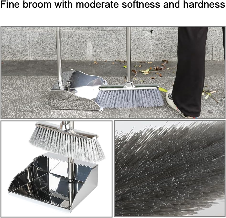 Broom and Dustpan Set,Soft Bristles Indoor Kitchen Broom with Stainless Steel Dustpan ,Metal Dust Pan,Silvery White, Suitable for Ceramic Tiles, Solid Wood, Composite Flooring
