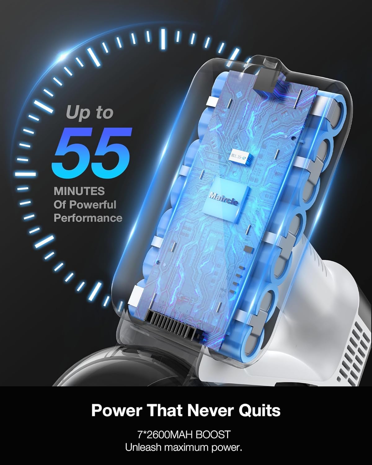 - 𝟱𝟱 𝗠𝗶𝗻𝘂𝘁𝗲𝘀 𝗼𝗳 𝗖𝗼𝗻𝘁𝗶𝗻𝘂𝗼𝘂𝘀 𝗣𝗼𝘄𝗲𝗿: Clean more, charge less. This rechargeable vacuum delivers up to 55 minutes of runtime—enough to cover up to 1500 sq ft in one go. Perfect for busy homes and multi-surface deep cleaning.
