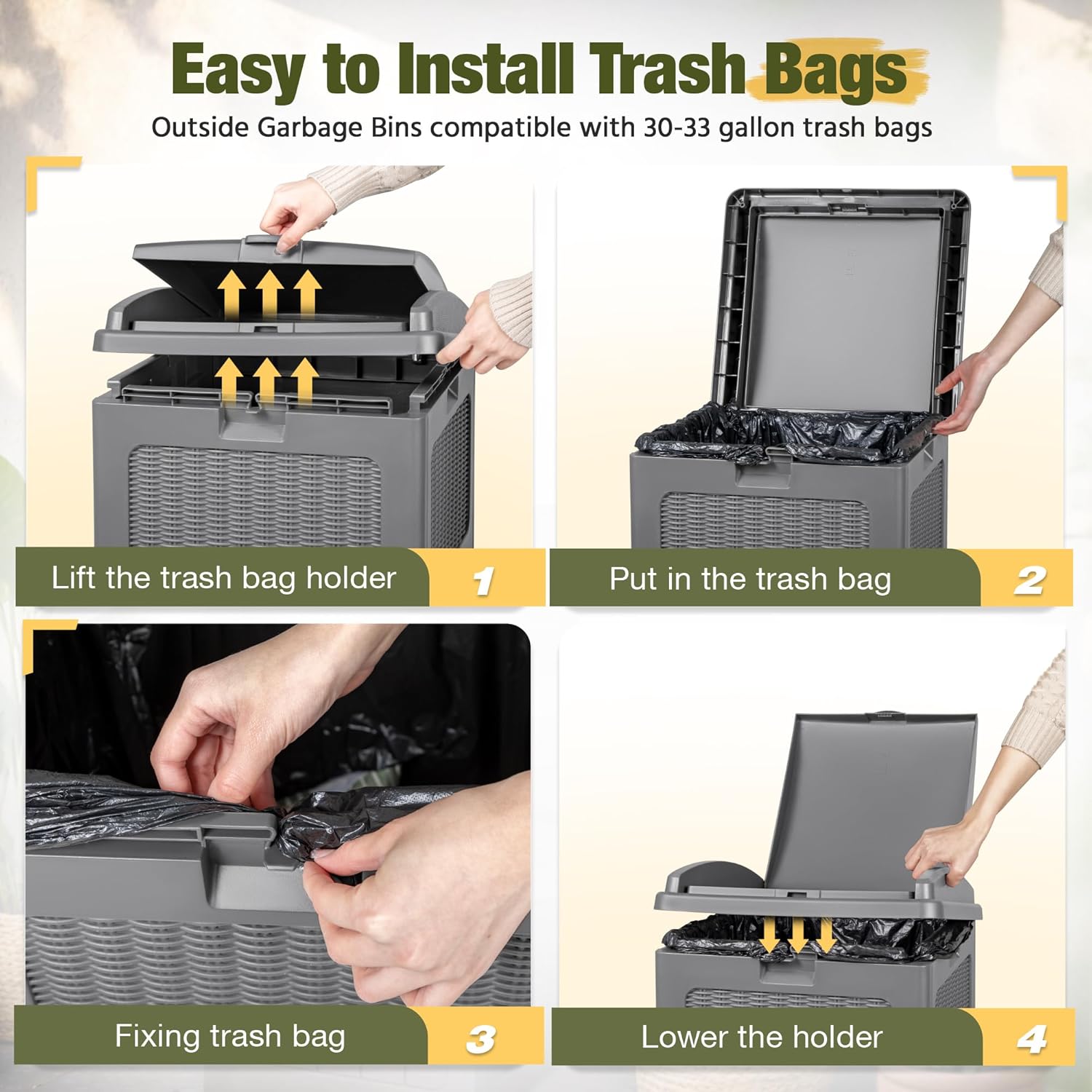 - Smart Dual Lid Design: This trash can designed with Innovative dual lid hides trash bags for a tidy yard, the outer lid opens and closes easily with one hand and keeps out odors, the inner lid stabilizes trash bags in place