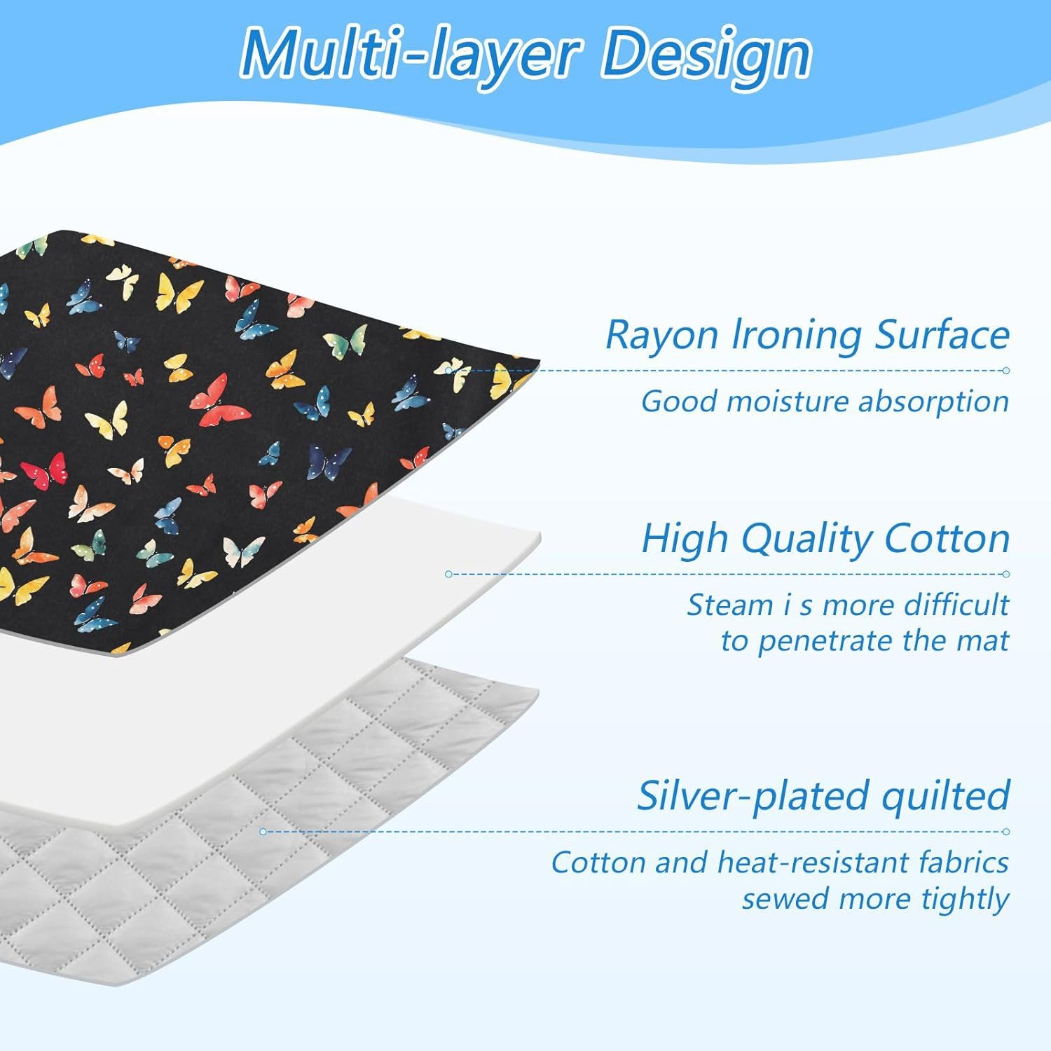 - High Quality:This ironing mat adopts a multi-layer design, with a surface made of Rayon lroning and good moisture absorption. High quality cotton in the middle makes it Steam more difficultto penetrate the mat. The bottom layer is coated with 210 silver-plated quilted, with cotton and heat-resistant fabricssewed more tightly. The ironing pad can be used on both sides, making it more durable