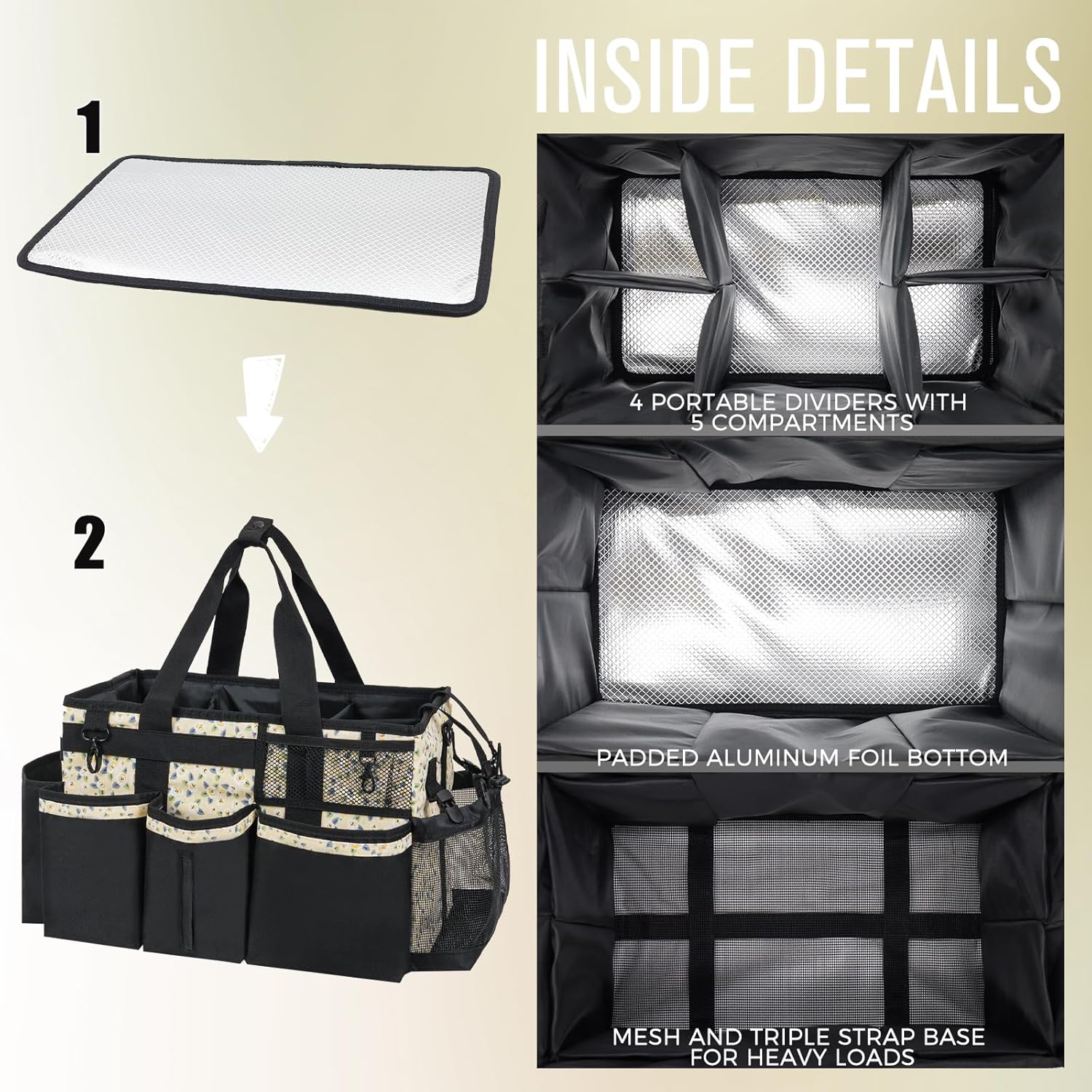 Wearable Cleaning Caddy, Cleaning Caddy Supplies Organizer with Handle & Shoulder Straps for Housekeepers, Under Sink & Car Cleaning Tool Organizers Bag with 4 Foldable Divider (YellowFlower)