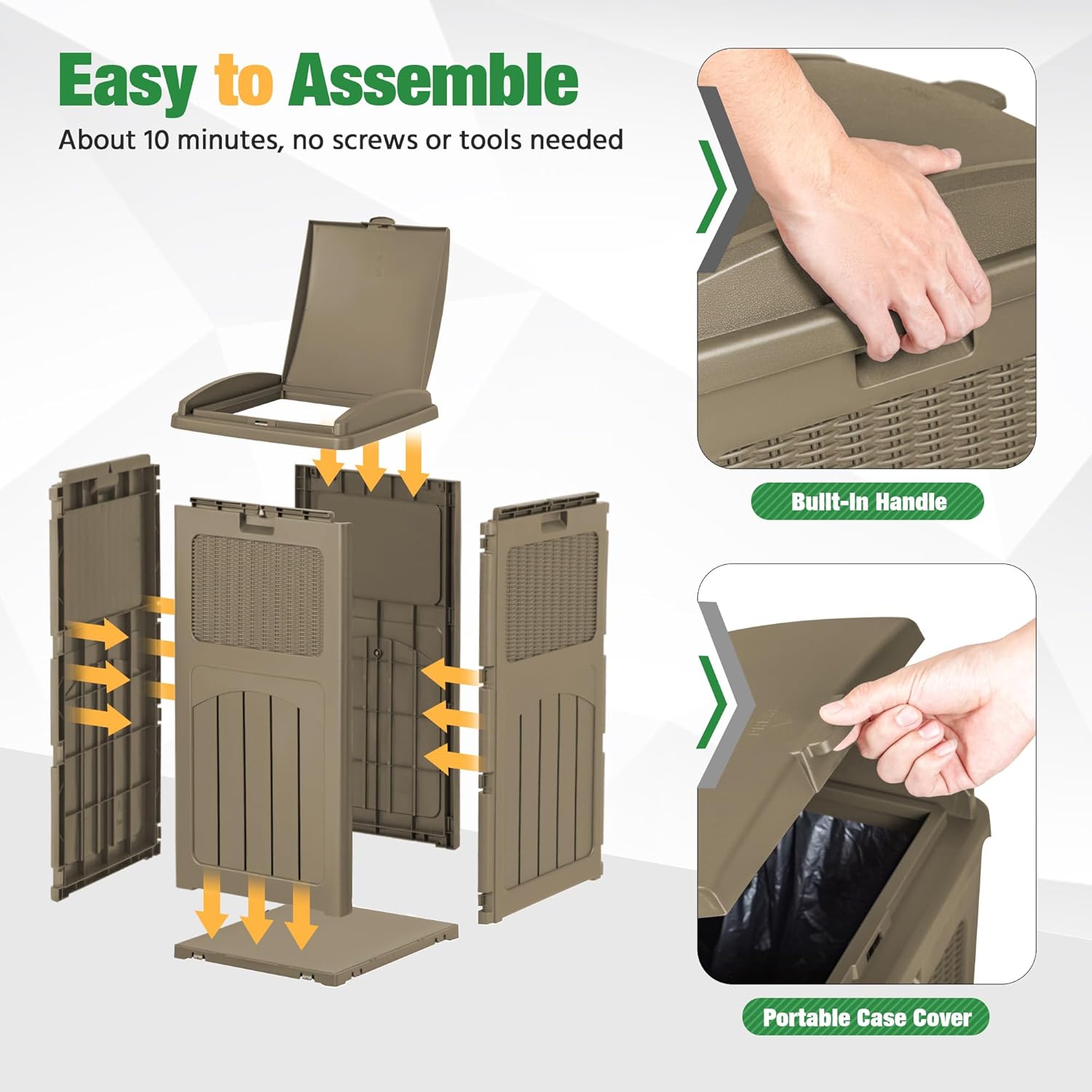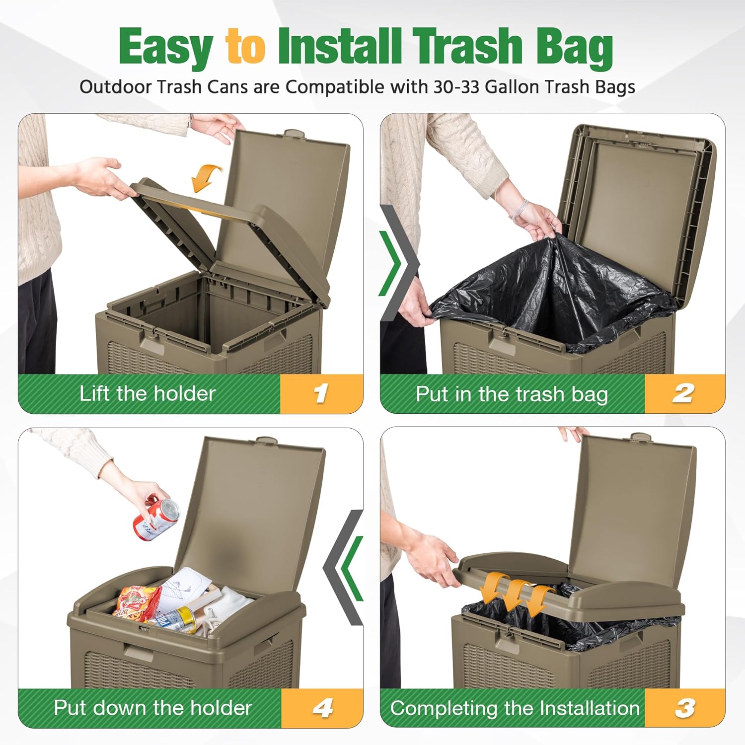 - Easy to Install Trash Bags: The waste bin for outdoors is compatible with 30-33 gallon trash bags. You need to lift the trash bag holder, put on the trash bag, put down the holder, and then finish the installation. After opening the inner lid, the garbage bag can be stably fixed in the card slot