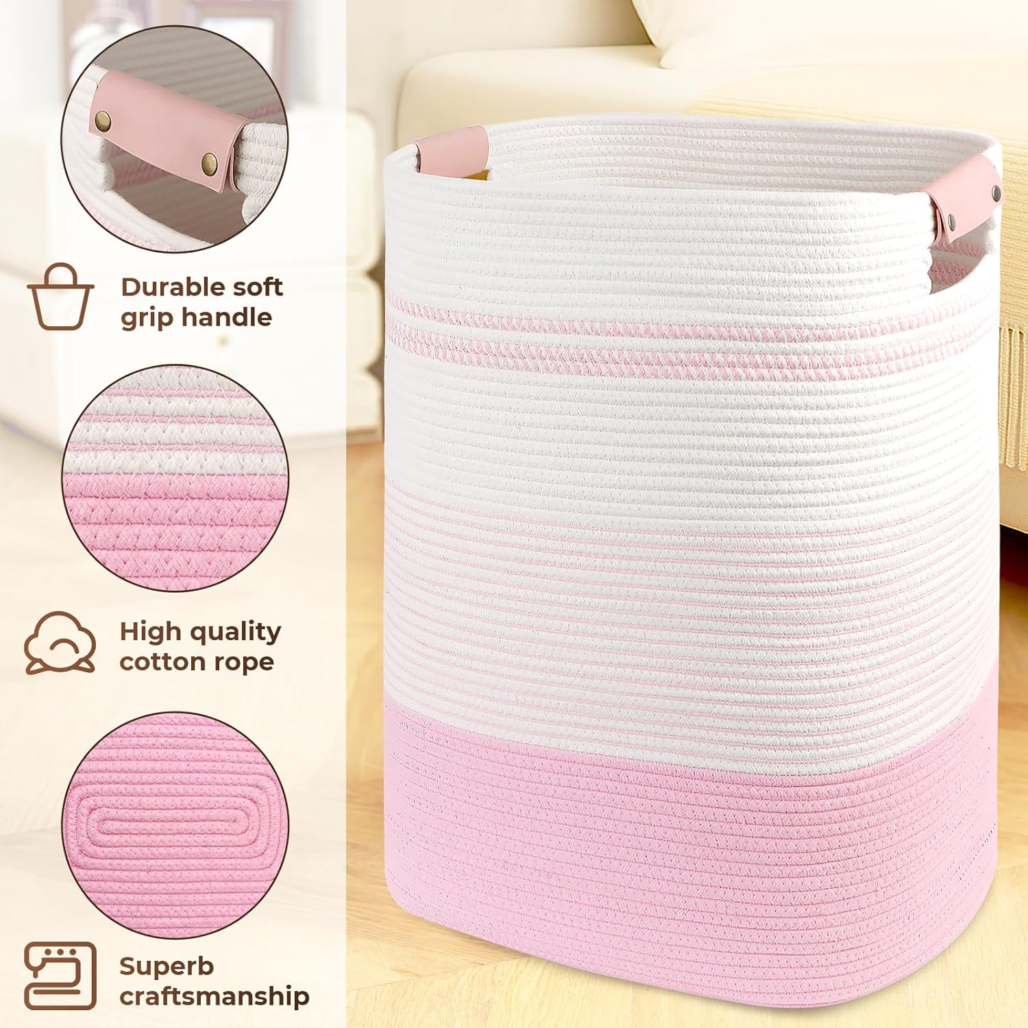 Laundry Basket with Handles - Blanket Basket & Hampers for Bedroom Aesthetic, Laundry Hamper & Blanket Storage for Living Room, Clothes Hamper, Tall, Large 17" x 14" x 22”, Pink & White