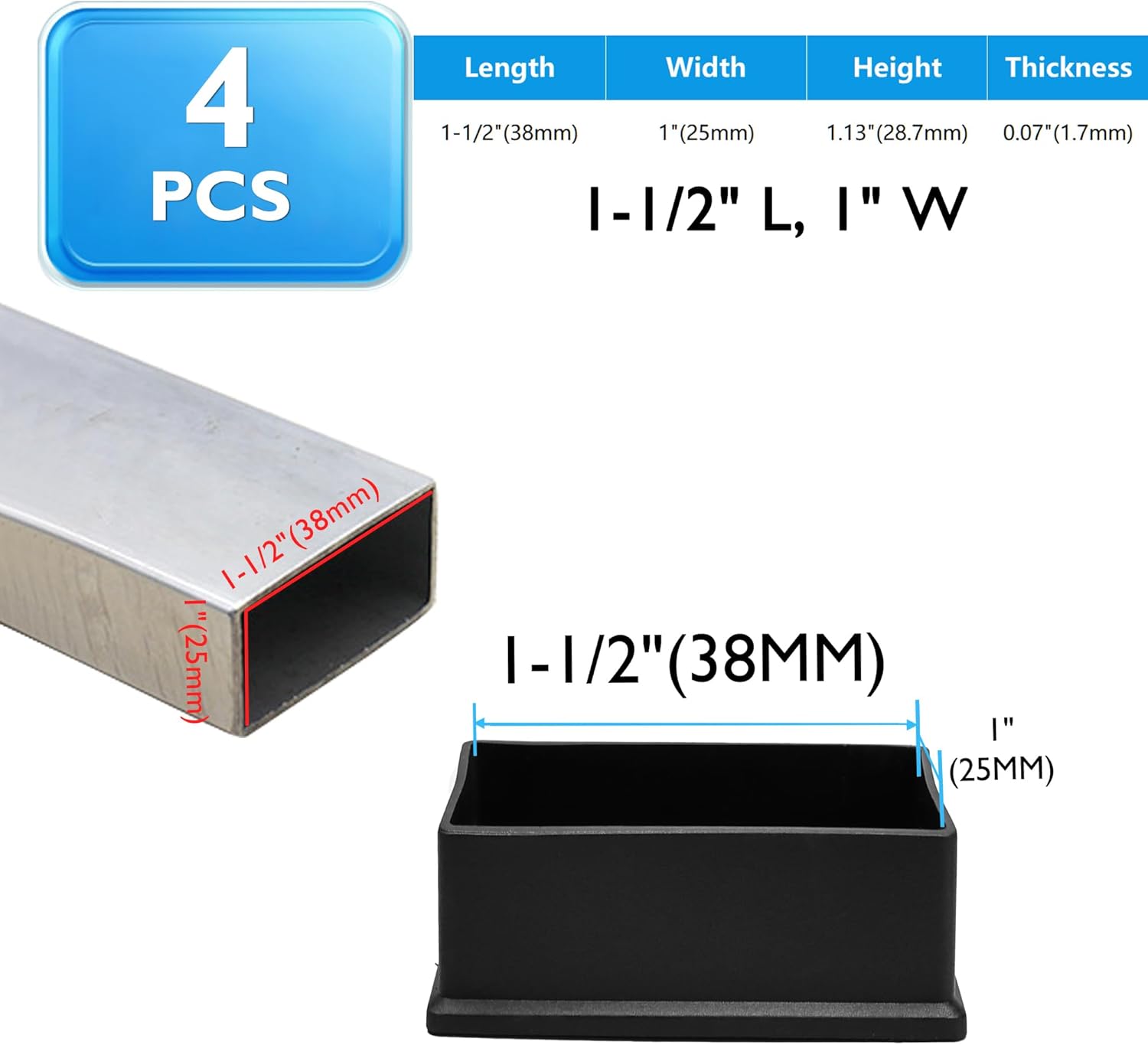 - Dimension and Quantity: 4 black rectangular chair leg floor protectors, suitable for 0.98"x1.49"(25x38 mm) OD rectangular chair legs; We offer different size options,including 1" - 4" rectangular chair feet, allowing you to find the perfect fit for your specific needs (Please confirm that you are measuring the outside, not the hole)