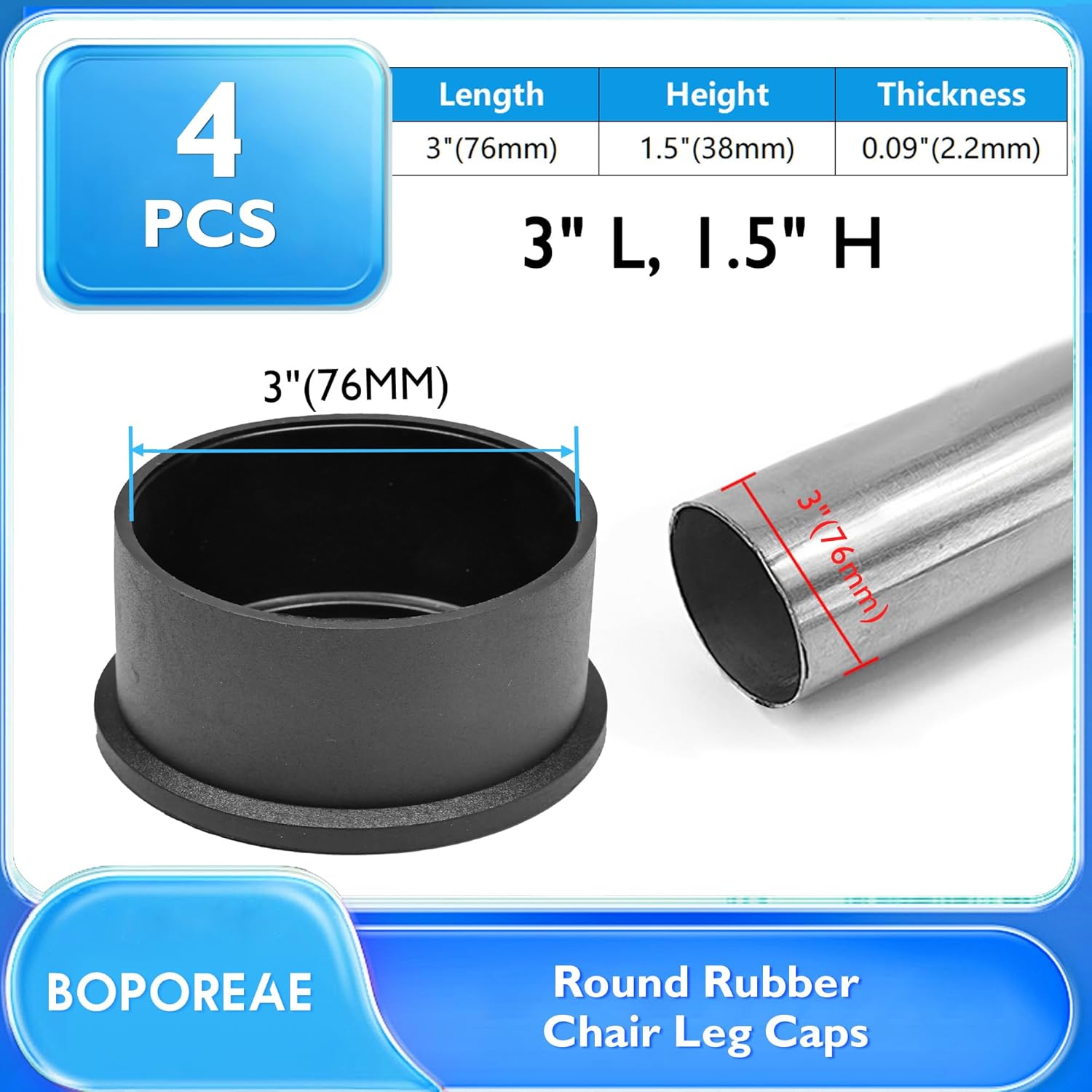 - Dimension and Quantity: 4 black round chair leg floor protectors, suitable for 3" OD round chair legs; We offer different size options,including 1"- 3" round chair feet, allowing you to find the perfect fit for your specific needs (Please confirm that you are measuring the outside, not the hole)