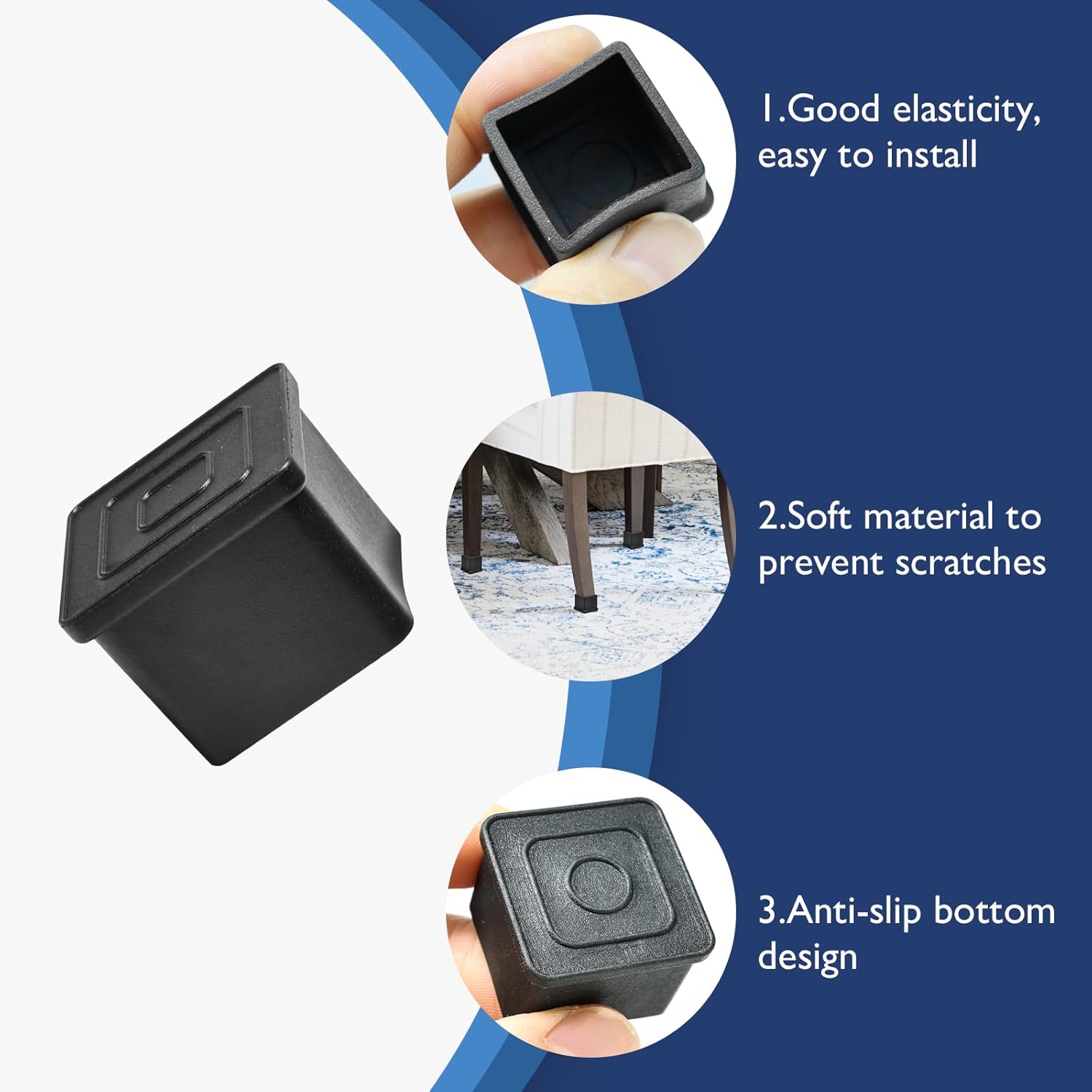 - Easy Installation: The installation of our stool leg floor protectors are easy and push the chair leg feet on; The high elasticity of furniture leg protectors make them easy to put on chair legs; Anti-slip design of chair protector holds the leg firmly and tighter(If the leg caps are hard to fit it, please soaking for a few seconds in warm water to soften them for snugly fit)
