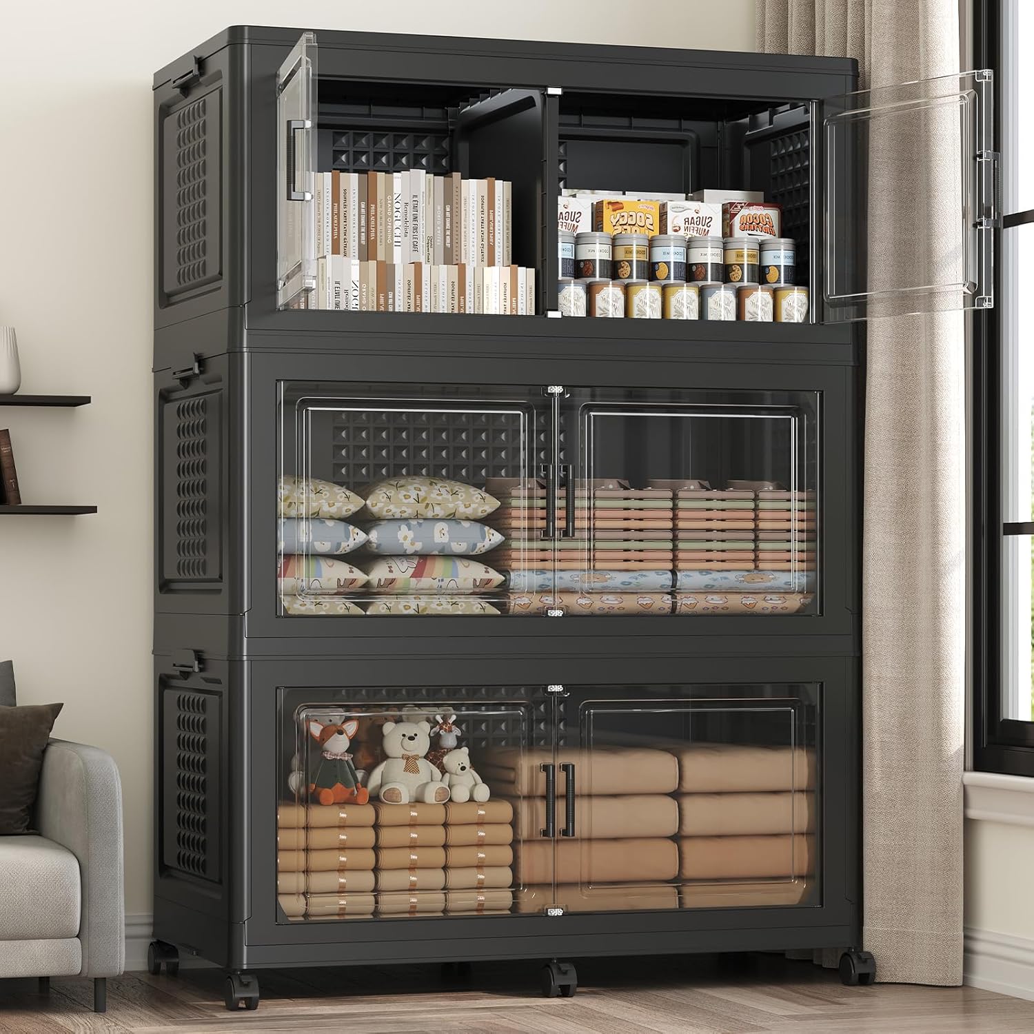 - 【6x Wheels, Foldable, Stackable, No Assembly】Fangtueh stackable storage bins open front can be quickly unfolded or collapsed in just 3 minutes to maximize space utilization. It can be stacked layer by layer into a cabinet, with side buckles to secure each level in place, preventing tipping or scattering. The bottom is equipped with 6 universal wheels for easy mobility. An essential large storage bin for homes and dorms.