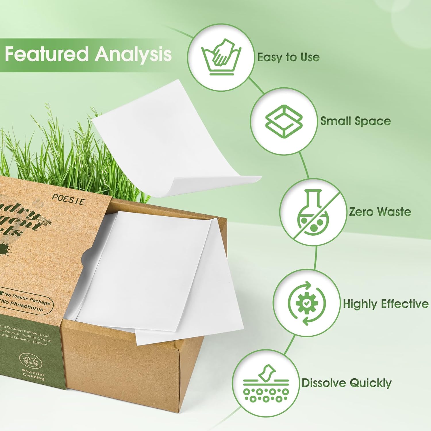 - Easy to Use - Liquidless detergent sheets, 1 sheet for small or medium loads where clothes are not very dirty, 2 sheets for large loads and 4 sheets for extra large loads, no waste. Not too little and not too much to save resources. Lighter Volume and Better Dissolving - the product is concentrated into a small piece, but has more powerful energy. And it can dissolve in water immediately, leaving your clothes fresh, clean and comfortable