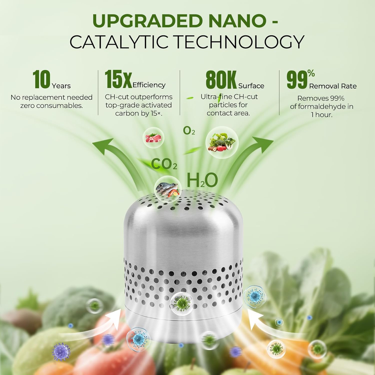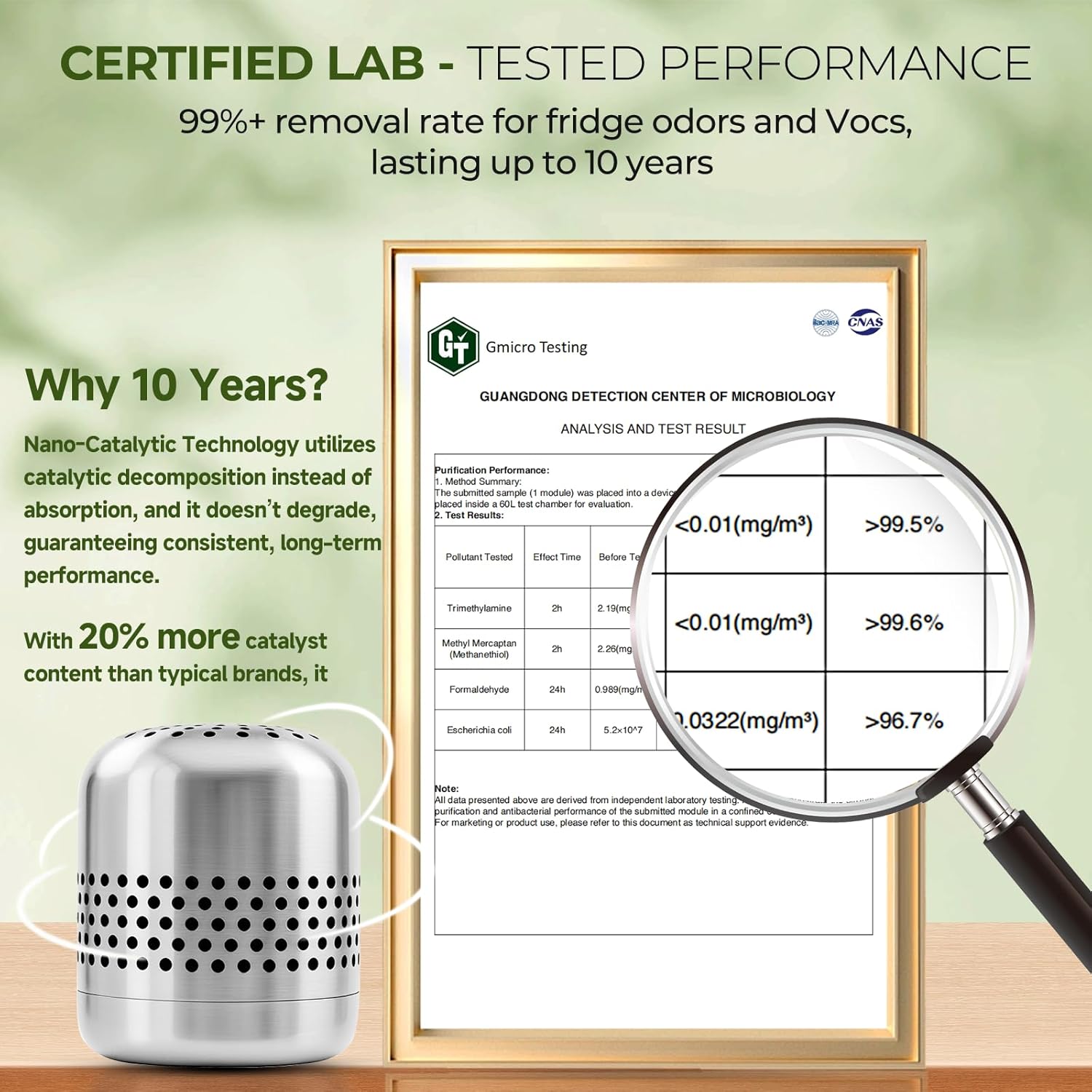 - ๐๐ฉ๐ ๐ซ๐๐๐๐ ๐๐-๐๐ฎ๐ญ ๐๐๐๐ก๐ง๐จ๐ฅ๐จ๐ ๐ฒ - No more lingering fridge odors. Our refrigerator deodorizer features an advanced composite nano-catalyst that breaks down harmful VOCsโlike formaldehyde, benzene, and tolueneโinto harmless substances. It also generates active radicals that neutralize odor molecules at the source, outperforming traditional absorbers that simply trap smells.