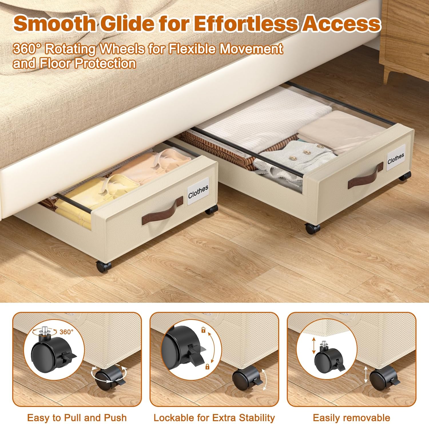 - 360° Rotating Glide Wheels: Equipped with 2 side handles and 4 smooth-rolling 360° rotating wheels, this storage unit glides effortlessly on different surfaces. No noise during sliding, making it ideal for use in bedrooms, living rooms, dorms, shoe cabinets, attics, basements, and more.