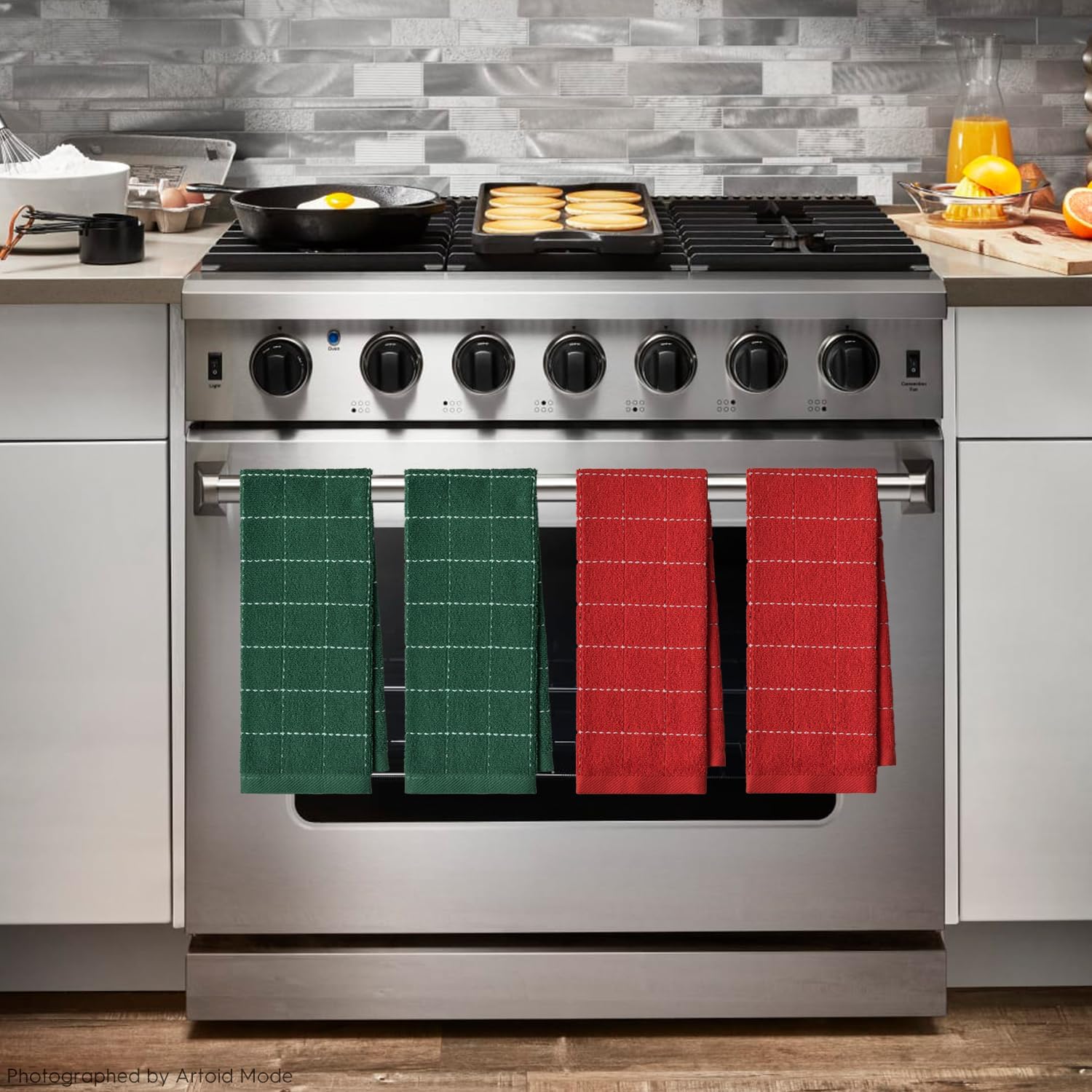 Artoid Mode Checkered Designed Cotton Red Green Terry Kitchen Dish Towels, 15x25 Inch Soft Absorbent Quick Drying Cleaning Tea Towels Set of 4