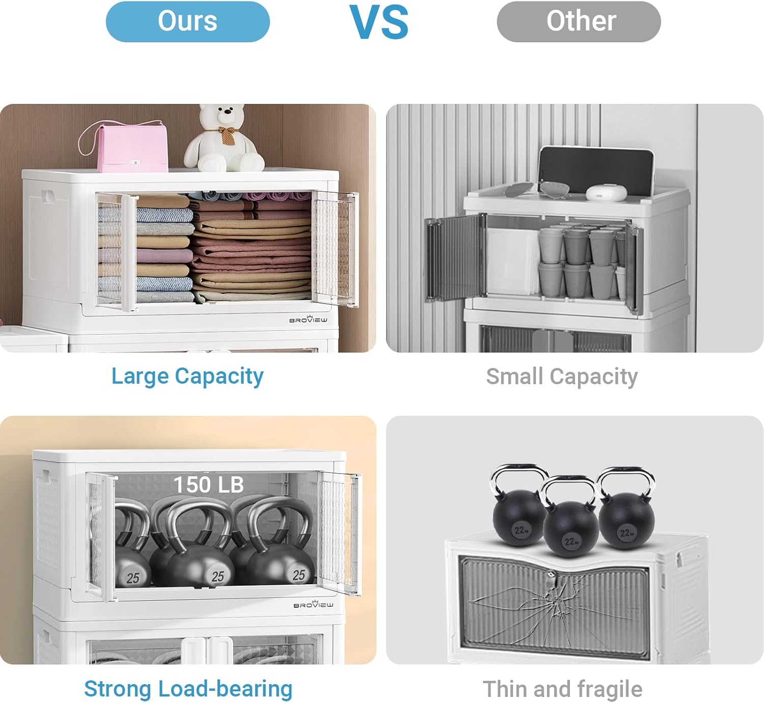 - 【Stackable and Foldable Design】 You can stack different numbers of plastic storage bins you want, such as bedside cabinets, clothes cabinets, bookcases, kitchen cabinets, etc. With roomy capacity, odorless, and foldable design, these storage containers are perfect for your closet organizer, laundry organizer, trunk organizer, garage tote, playroom storage, book storage shelves, classroom bins, and dorm storage box.