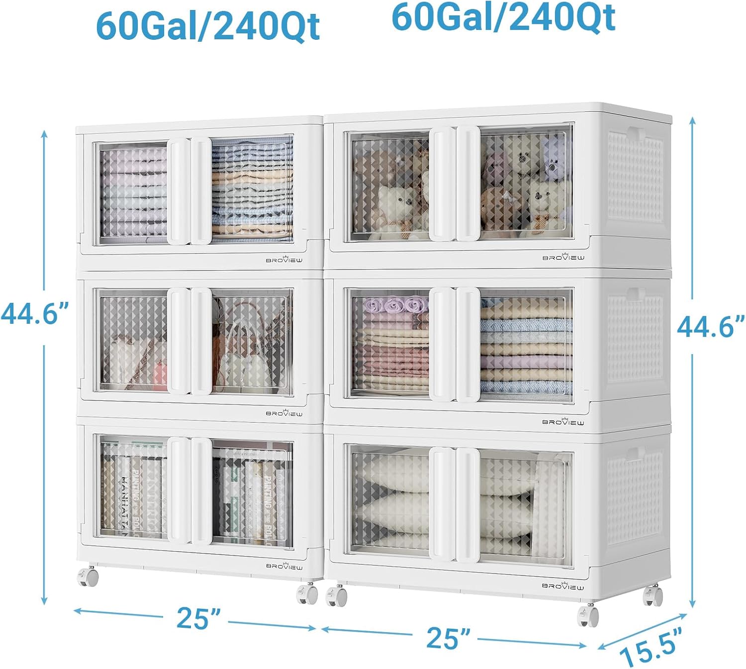BROVIEW 120Gal Stackable Storage Bins with Lids & Wheels, 480Qt Plastic Collapsible Closet Organizer and Storage Drawers, Storage Boxes Cabinets for Home, Office, 6 Pack, White