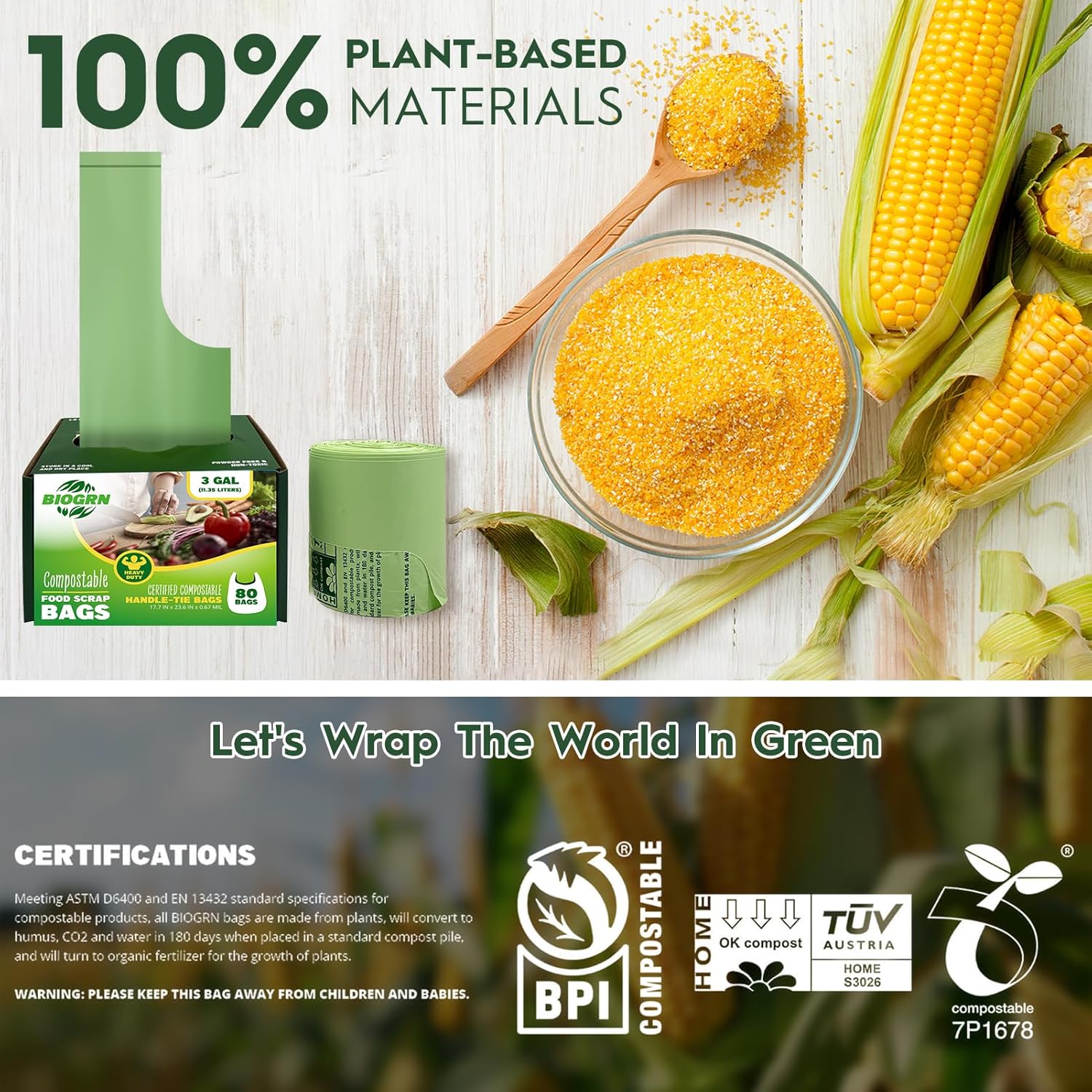 - Perfect 3-Gallon Compost Bags:These 3-gallon compostable trash bags (11.35L) measure 17.7" x 23.6" - the ideal size for countertop bins and food waste collection. Each roll contains 80 durable 0.67-mil thick bags with convenient handle ties for easy closure and carrying. Perfect as kitchen compost bags or for office waste disposal. Factory-tested to hold up to 22 lbs (10 kg), they offer sturdy strength for heavy waste while maintaining tear-proof durability.