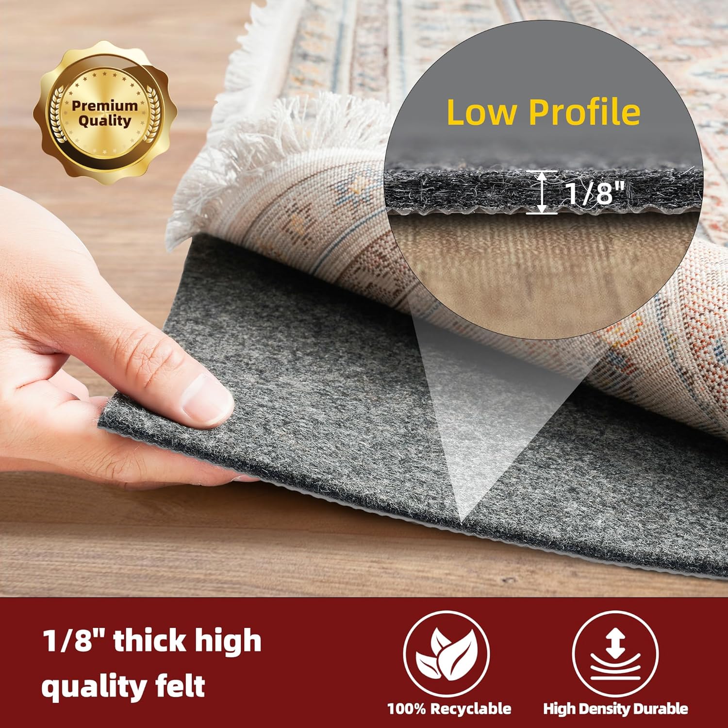 - Upgraded Cushioning and Grip: Unlike other pure felt pads, our pad has a durable natural rubber backing to increase gripping and durability. 1/8" thick felt forming a dense, cushioned surface, aims to make your rugs cozier and provide extra comfort underfoot, even the thinnest rugs can feel soft and comfortable. Dense fibers surface securely holds rugs in place without bunching, while offering noise reduction and insulation