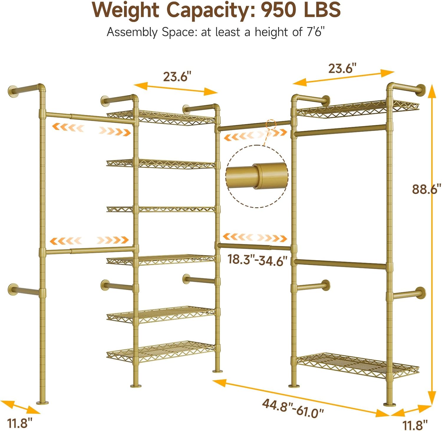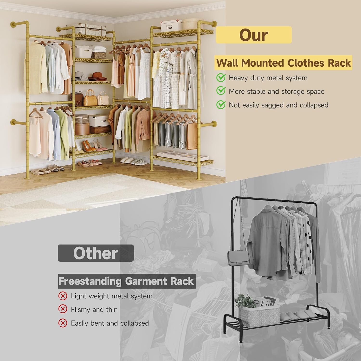 ONBRILL L4 Wall Mounted Industrial Pipe Clothing Rack, Closet Organizer System with 6 Hanging Clothes Rods ( 4 Expandable Rods) & 8 Shelves, Heavy Duty Corner Garment Rack, Large Wardrobe - Gold