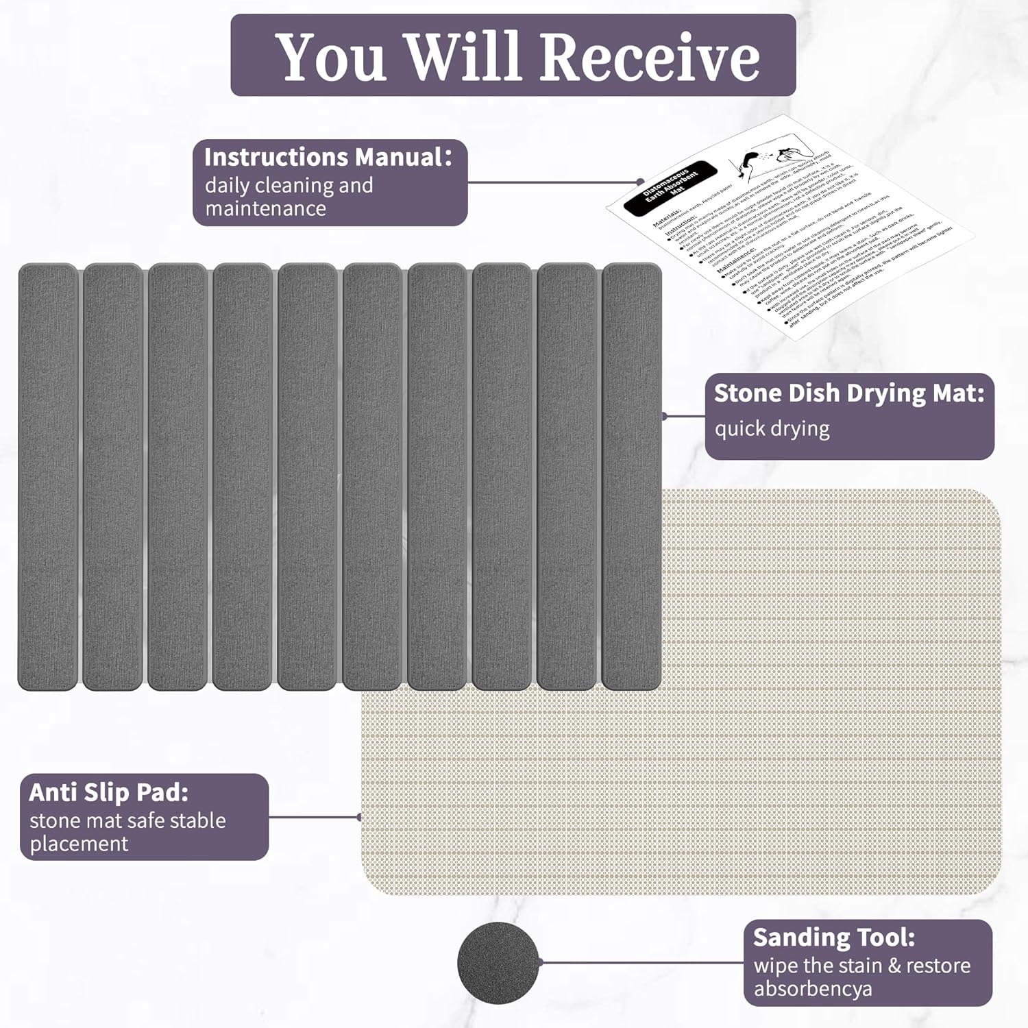 - 【Lightning-Fast Drying Performance】Tired of wet countertops? Our quick dry stone mat kitchen soaks up moisture instantly, thanks to its natural diatomaceous earth material. This stone drying mat dries dishes 50% faster than standard mats - perfect for busy kitchens and large dish loads!