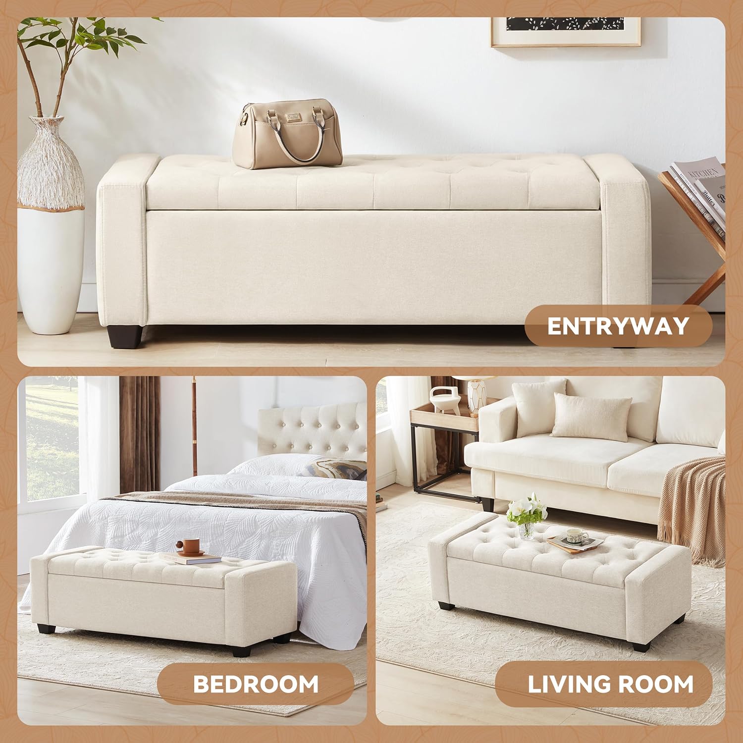 48" Ottoman with Storage, Large Storage Ottoman Bench for Bedroom with Safety Hinge, Upholstered Tufted Window Benches, End of Bed Bench for Living Room, Entryway Bench with Seating, Beige