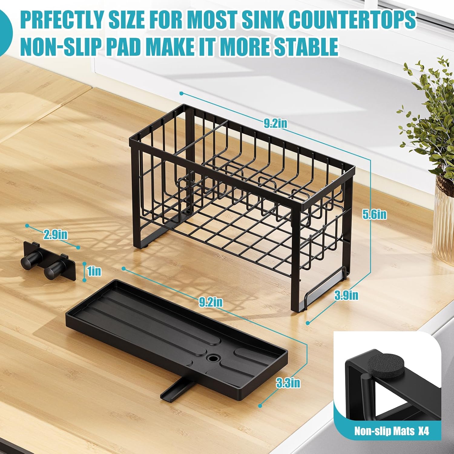 - DOUBLE-LAYER CAPACITY:The upgraded sponge holder comes with a 2 tier sink rack and a brush holder.Holds 2 soap dispenser,sponges,scrubber,sink stopper,steel wool etc.The added movable smiley sponge holder provides extra storage for your smiley sponge.It has a large capacity but occupies a very small space,making it suitable for kitchens with limited space and keeping sink countertops clean and tidy