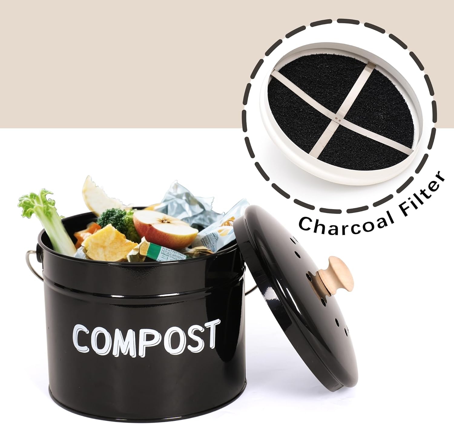 Compost Bin for Kitchen Counter, 1 Gallon Compost Bucket with Lid and Charcoal Filter, Countertop Composter, Rust Proof Indoor Food Waste Bin, Black