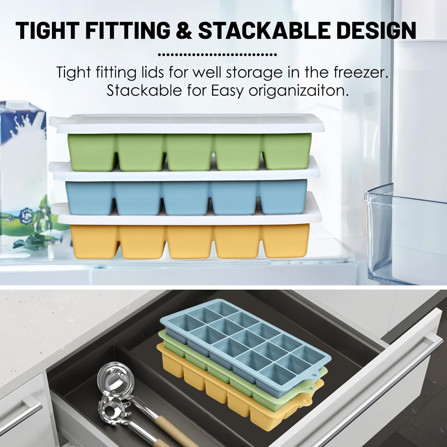 Silicone Ice Cube Trays 3Packs, Easy Release Ice Cube Molds with Lid, Freezer Stackable Ice Maker for Whiskey, Baby Food, BPA Free (3, Blue+Green+Yellow)