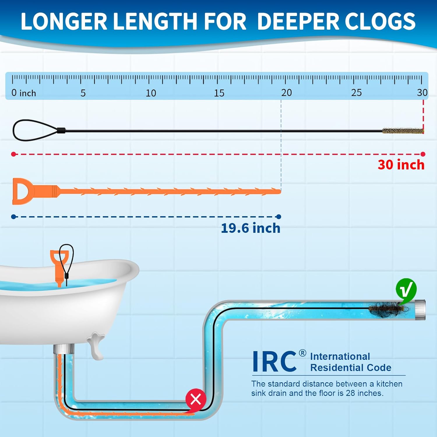 - 30" Hair Snake Reaches Deeper Clogs: Extended 30-inch shower drain clog remover for reaching deep hair clogs that other plastic snakes miss. Eliminate tough hair clogs without costly plumber calls - the right size saves time & money